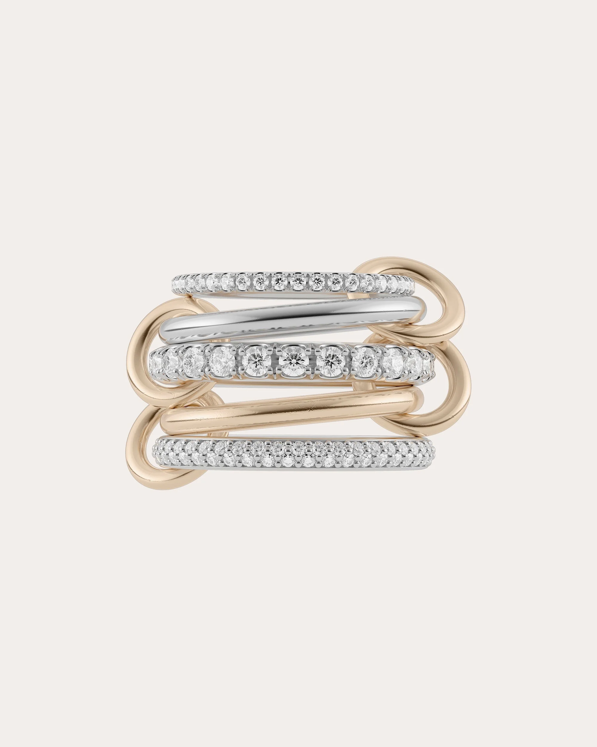 A study in fluid tactility, the Leyla ring features multi-gauged bands with linked connectors that can be worn across multiple fingers or stacked as one. The sterling silver and 18-karat gold design is embellished with a stunning array of round-cut diamonds. 18k yellow gold, sterling silver and diamond Diamond: 2.77 ctw Diamond color: white Polish with soft cloth Handmade in the USA Sustainability Metrics: Circular Economy: product is intentionally designed with 50% of actively cycled materials Conflict-Free: 100% of products are recycled or conflict-free and adhere to fair trade and labor Craft & Community: at least 75% of products are fully sourced and manufactured within the specified community or country; 100% of production adheres to a fair wage system Read more about Olivela's sustainability pillars here .