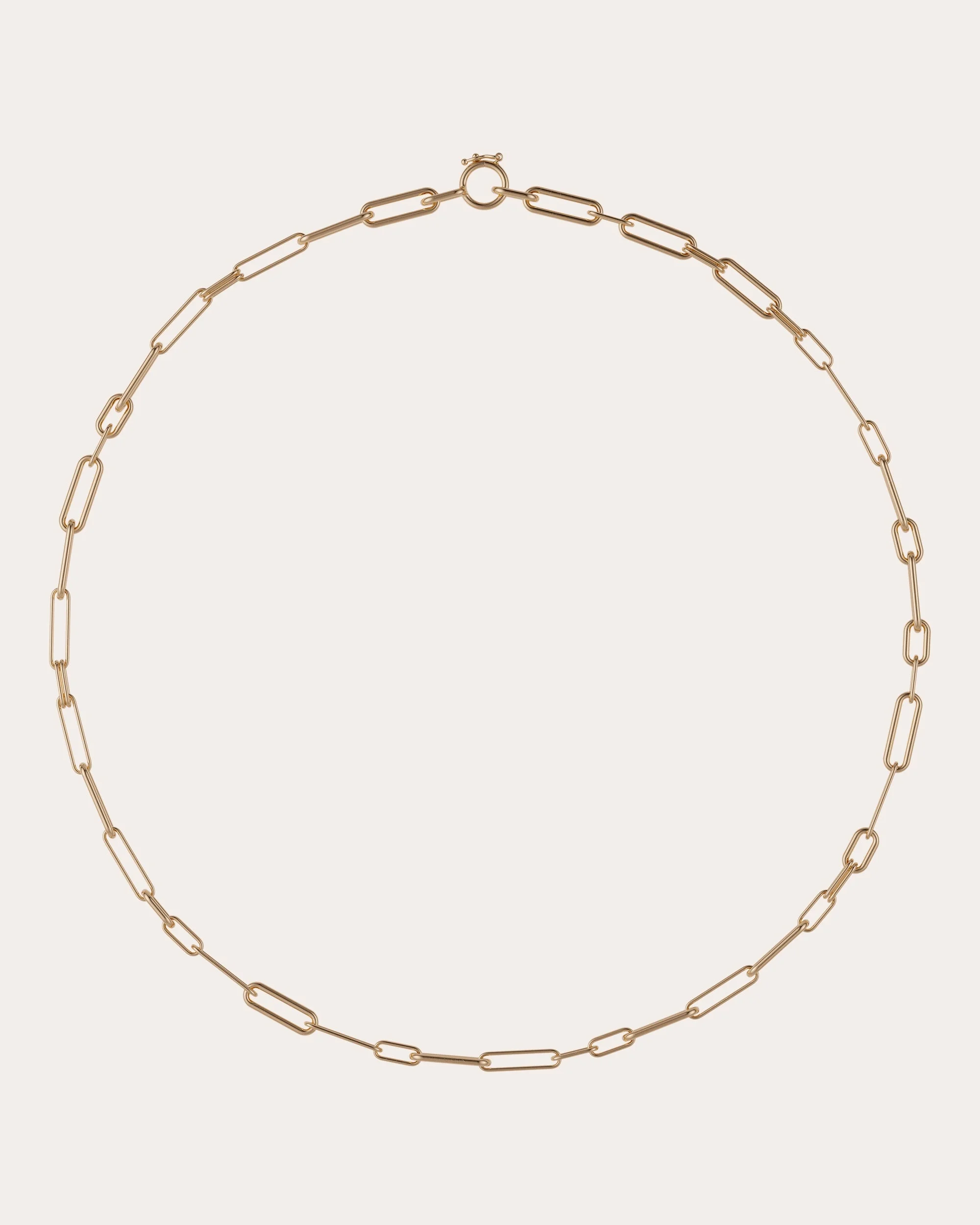 A study in sartorial minimalism, the Marius chain necklace is forged in solid 18-karat gold and showcases alternating single and double elongated links of varying lengths and gauges. Seamless circular clasp with safety closure 18k yellow gold Polish with soft cloth Handmade in the USA Size & Fit Chain length: 18in Sustainability Metrics: Circular Economy: product is intentionally designed with 50% of actively cycled materials Conflict-Free: 100% of products are recycled or conflict-free and adhere to fair trade and labor Craft & Community: at least 75% of products are fully sourced and manufactured within the specified community or country; 100% of production adheres to a fair wage system Read more about Olivela's sustainability pillars here .