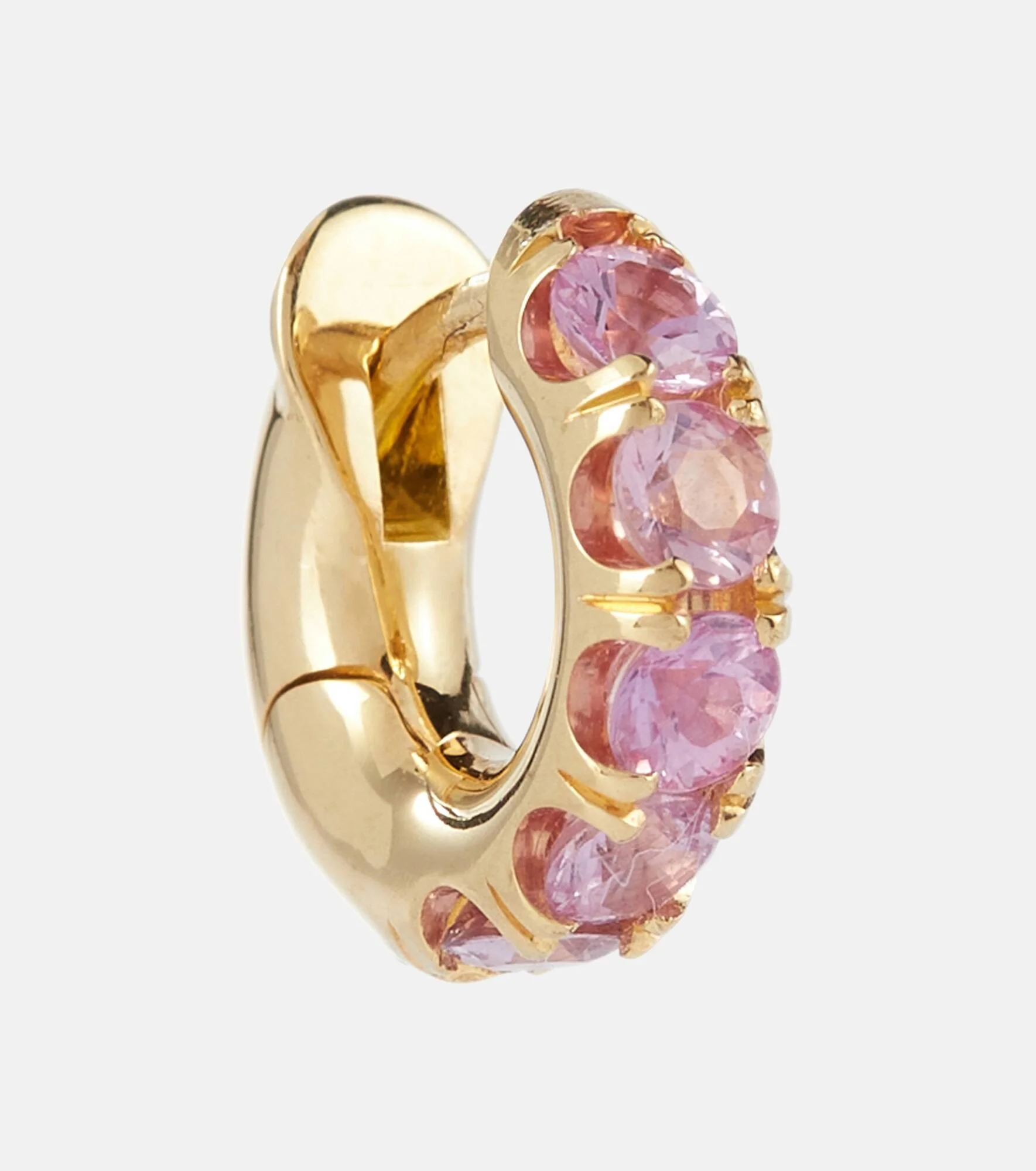 When it comes to glamorous accessorizing for a black-tie occasion, the Mini Macro Hoop earring from Spinelli Kilcollin is an obvious choice. Handmade in Los Angeles from 18-karat yellow gold, it's set with 0.5ct pavé pink sapphires that add a luminous touch. It's designed for pierced ears and, as a single piece, is meant to be mixed-and-matched with other stunning options from the label. Product Details - Material: 18kt yellow gold - Handmade in the USA - Stone I: sapphire, round-cut, prong setting - Closure: hinge - Single earring - For pierced ears - Designer color name: Pink/Gold - Item number: P00588106 Size & Fit - Max. width 3mm-0.1" - Diameter 12mm-0.45" - Inner diameter 6mm-0.25"