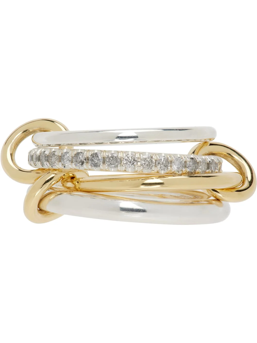 Connected and stacked rings in sterling silver and 18k gold. · Connecting hoops in solid 18k gold · Pave-set gray diamonds at band · Diamonds: approx. 0.70 cttw · Hallmarking at inner band Supplier color: Silver/Gold 925 sterling silver, 18k gold, diamonds. Made in United States 261558F011018