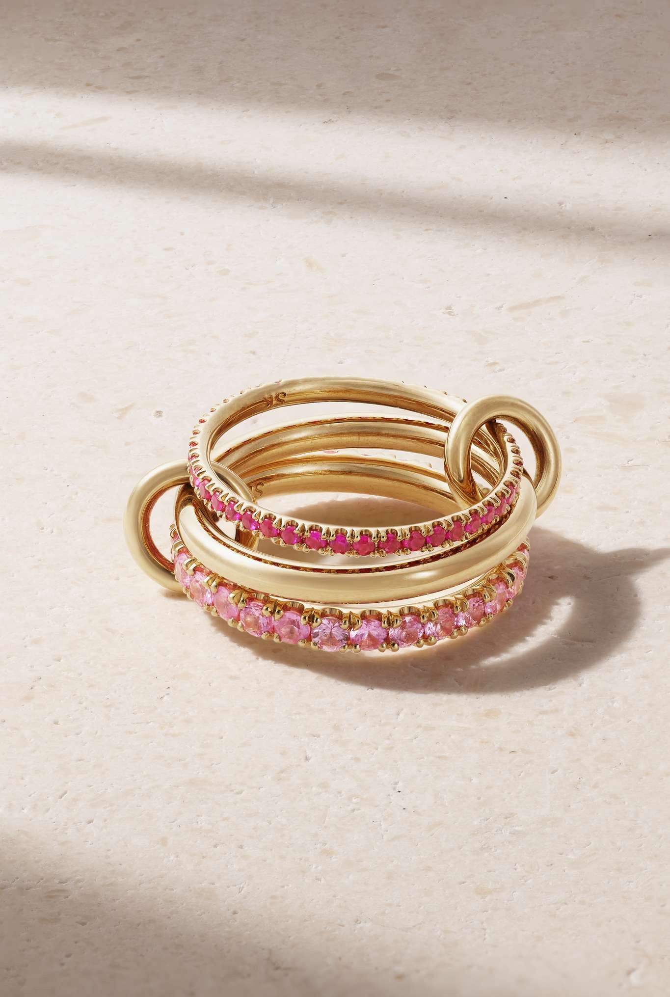 Spinelli Kilcollin says that "creative integrity has been a central tenet" of its collections for over a decade. This 'Norah' set of three rings is connected together by small links, so you can wear it stacked on one finger or spread across the hand. They're made 18-karat gold and set with radiant sapphires. Size & Fit - US sizing - Measurements can be found in the link below Details & Care - Pink sapphires, total weight: 1.90-carats - This piece is handmade and as such may have some small flecks or scratches - This piece has been certified in accordance with the Hallmarking Act 1973