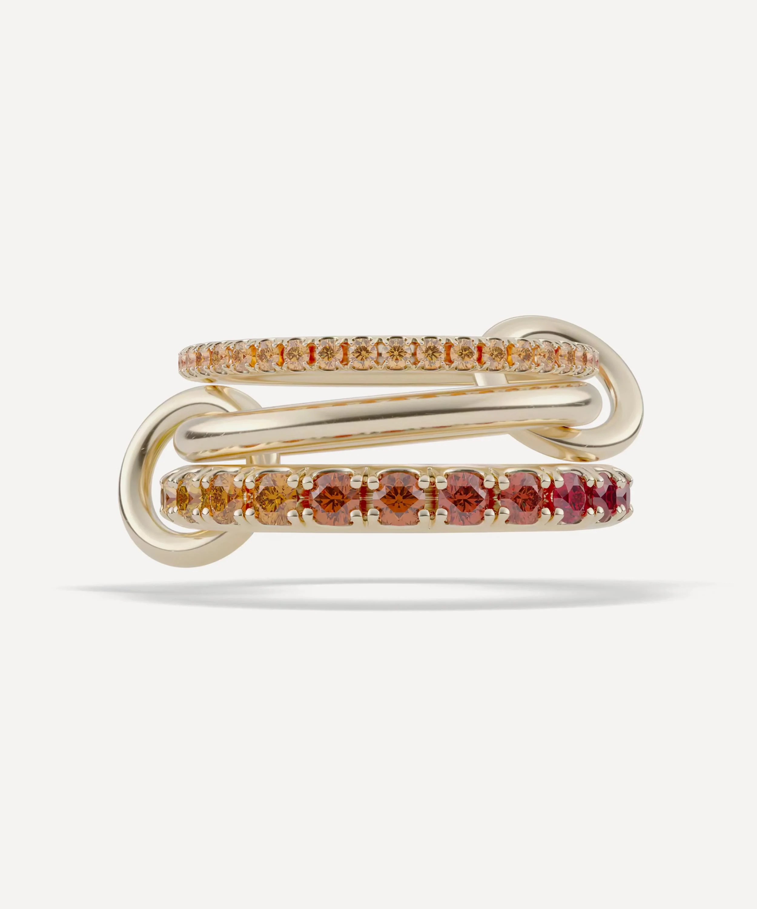 DETAILS Ring 18ct gold linked bands 18ct gold linked connectors Pave-set golden and orange sapphires Handcrafted in Los Angeles Spinelli Kilcollin uses US ring sizing COMPOSITION & SIZE 18ct Gold; 1.90 Mixed Sapphires This ring is available in size 7 only UK: O, US: 7.25, EUR: 55
