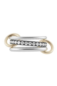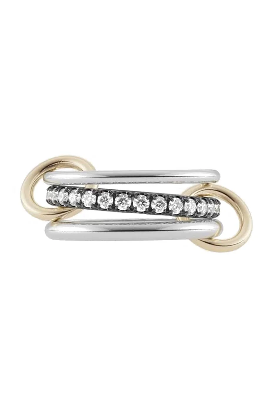 DETAILS AND INSIGHT Spinelli Kilcollin's Petunia SP is crafted of three linked bands in sterling silver and black rhodium plating with pave white diamonds and yellow gold connectors. Size 7 Diamonds (TW 1.20cts) Sterling Silver Style G3-PETSP