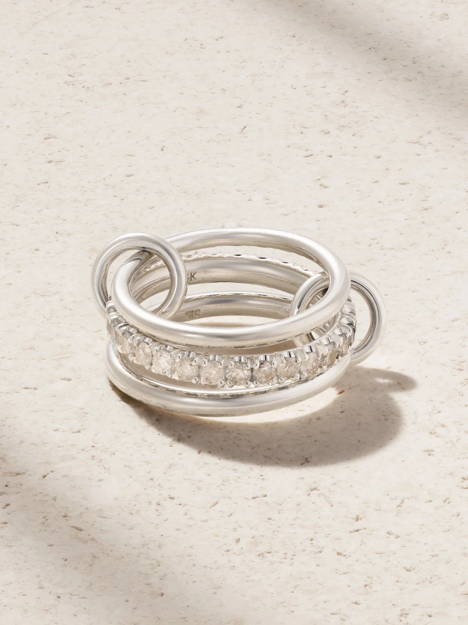 Spinelli Kilcollin's interlocking 'Petunia' ring is handcrafted from sterling silver and has connectors, so you can style them stacked or spanned out across your fingers. The central band is set with 1.40-carats of diamonds in a pretty ombre. Size & Fit - US sizing - Measurements can be found in the link below Details & Care - Round brilliant-cut G VS, gray and black diamonds, total weight: 1.40-carats - The black color of these diamonds is the result of an artificial treatment process - This piece is handmade and as such may have some small flecks or scratches - This piece has been certified in accordance with the Hallmarking Act 1973
