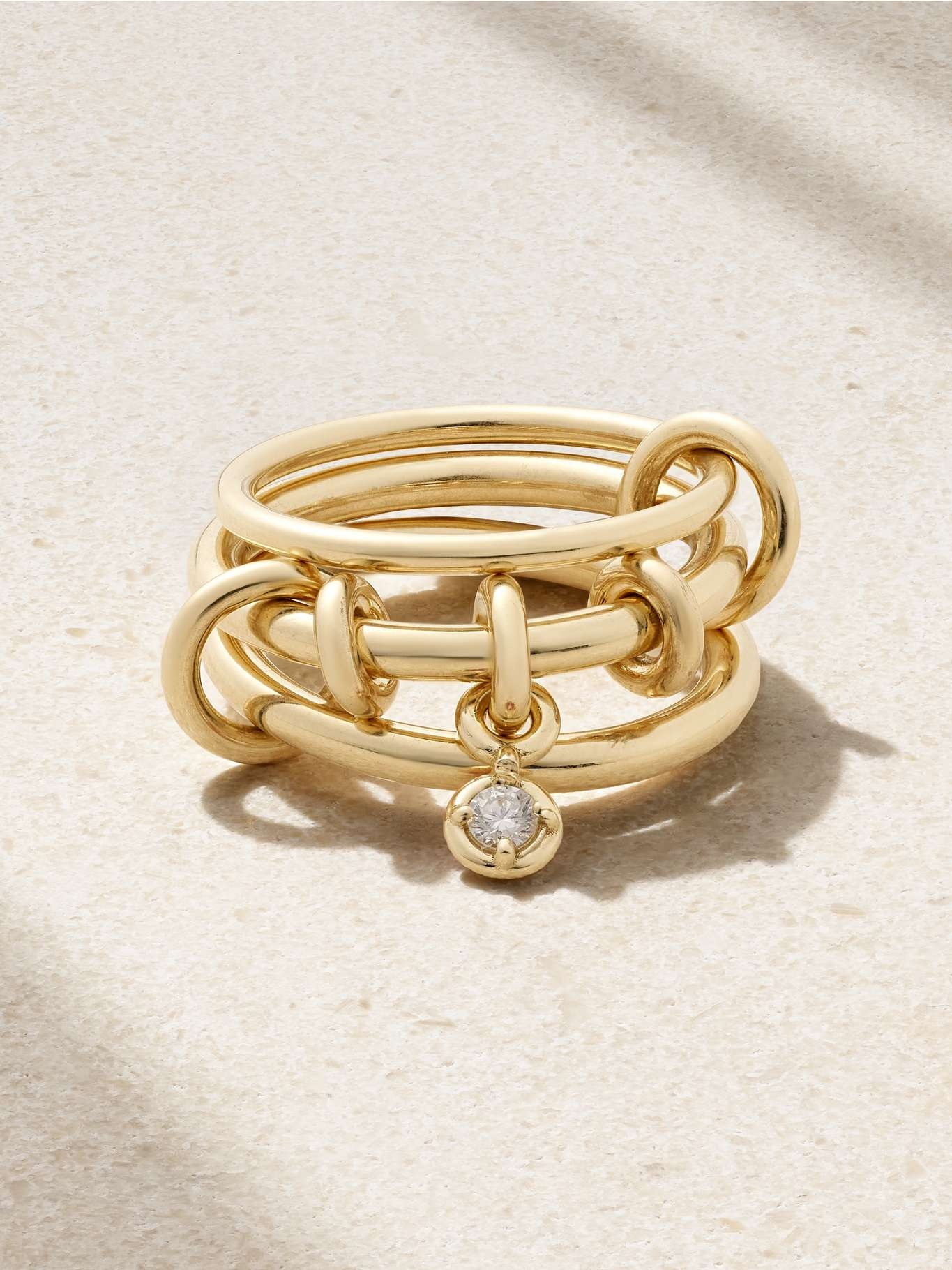 EDITORS'NOTES Spinelli Kilcollin describes its aesthetic as "clean, conceptual and innovative" - three words that certainly come to mind with this 'Piera' ring set. Handmade from 18-karat gold, it includes three connected bands in the signature 'Galaxy' design and a single diamond charm. Wear yours stacked or split across your fingers. SIZE & FIT - US sizing - Measurements can be found in the link below DETAILS & CARE - Diamond, total weight: 0.11-carats - This piece is handmade and as such may have some small flecks or scratches - This piece has been certified in accordance with the Hallmarking Act 1973