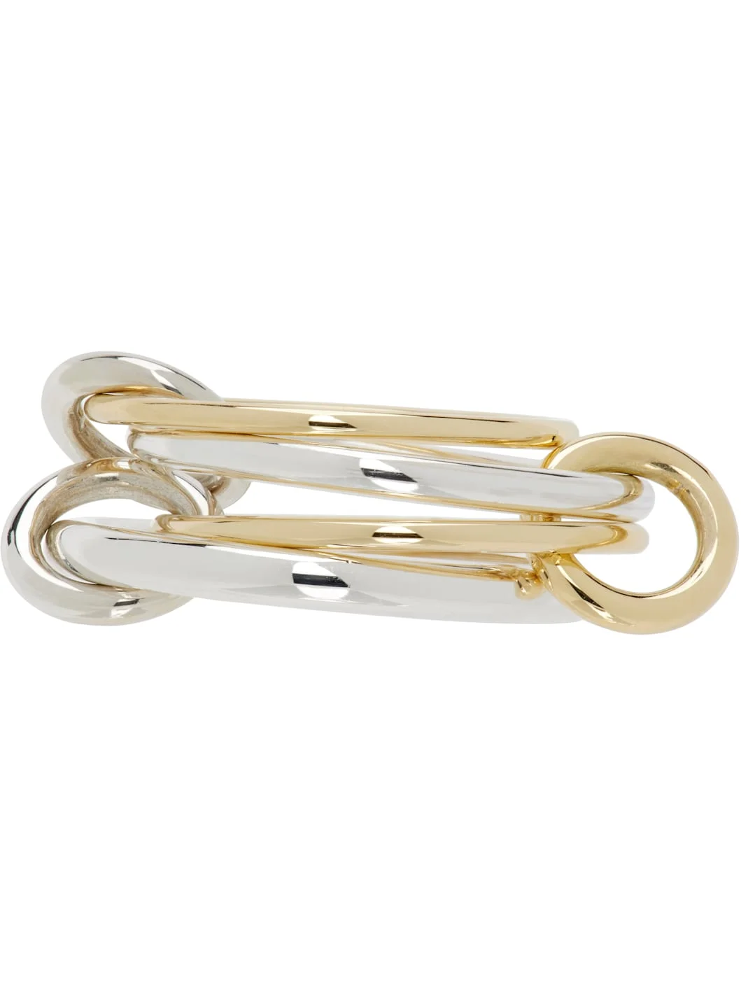 Connected and stacked band rings in 18k gold and sterling silver. · Connecting and sliding hoops · Hallmarking at inner band Supplier color: Yellow gold/Silver 925 sterling silver, 18k gold. Made in United States 261558F011012