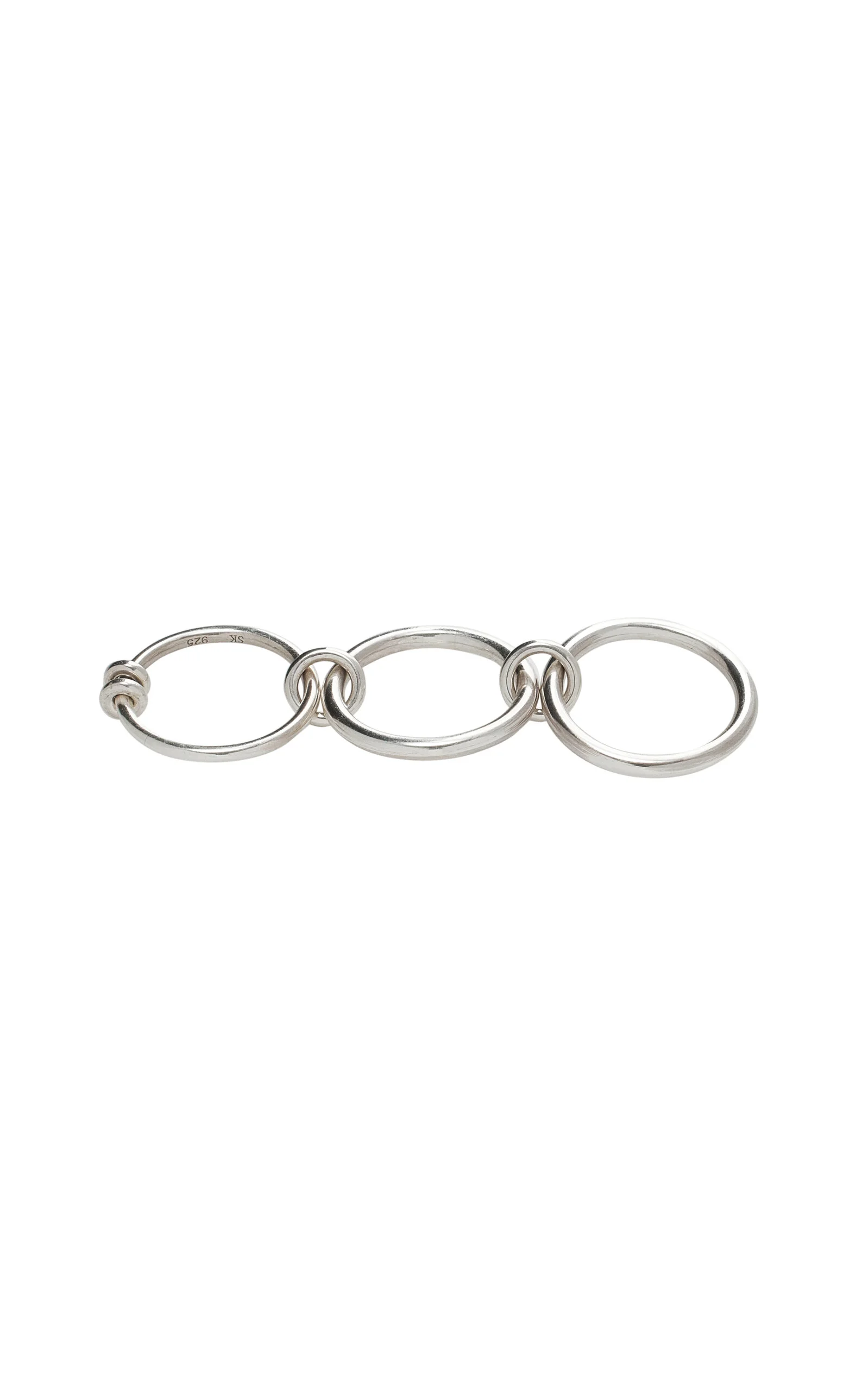 Husband and wife duo Yves Spinelli and Dwyer Kilcollin first gained recognition for their series of interconnecting rings that can either be stacked or worn across several fingers — that same innovative design aesthetic inspires their modern jewels to this day. The 'Raneth' features three linked rings in sterling silver with silver connectors and accents. PRODUCT DETAILS - Composition: .925 sterling silver - Made in the USA