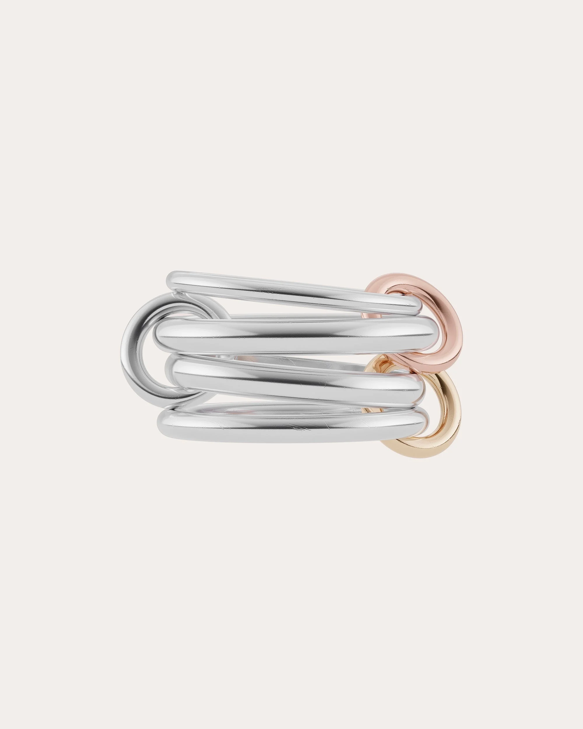 A study in fluid tactility, the Sagittarius ring features multi-gauged bands connected by orbiting links in sterling silver, 18k yellow gold and 18k rose gold hues. The unique piece can be worn across multiple fingers or stacked as one. Sterling silver, 18k yellow gold and 18k rose gold Polish with soft cloth Handmade in the USA Size & Fit Band widths: 1.7mm, 2.3mm, 2.7mm, 2.8mm Sustainability Metrics: Circular Economy: product is intentionally designed with 50% of actively cycled materials Conflict-Free: 100% of products are recycled or conflict-free and adhere to fair trade and labor Craft & Community: at least 75% of products are fully sourced and manufactured within the specified community or country; 100% of production adheres to a fair wage system Read more about Olivela's sustainability pillars here .