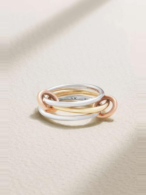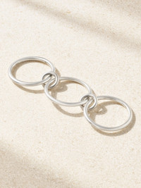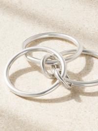Spinelli Kilcollin's pieces are inspired by the clean lines of modern architecture. This 'Solarium' set is handmade from sterling silver and features three bands held by matching connectors. Wear yours stacked or spread across your fingers. Size & Fit - US sizing - Measurements can be found in the link below Details & Care - This piece is handmade and as such may have some small flecks or scratches - This piece has been certified in accordance with the Hallmarking Act 1973