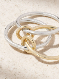 Spinelli Kilcollin's pieces are inspired by the clean lines of modern architecture. This 'Solarium' set is made from three sterling silver and 18-karat gold bands held by connectors. Wear yours stacked or spread across three fingers. Size & Fit - US sizing - Measurements can be found in the link below Details & Care - This piece is handmade and as such may have some small flecks or scratches - This piece has been certified in accordance with the Hallmarking Act 1973