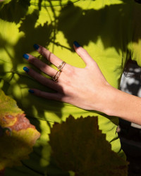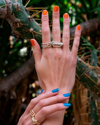 Designed with simplicity in mind, this ring features a core band of micro pave diamonds nestled between two thin silver bands. A duo of rich gold connectors create a look that is effortlessly chic and perfect for stacking. All diamonds are conflict-free for the conscientious wearer. This item is made to order, please allow 2-8 weeks for shipping. This item is final sale. The recycled metal is made exclusively from repurposed solid 18k gold and .925 silver, with conflict free diamonds and gems, exclusively sourced through respected suppliers in adherence with the Kimberley Process and World Diamond Council System of Warranties. Sterling silver, 18k yellow gold, and gray diamond Gray diamond: 0.5 tcw Hand polish Made in the USA Size & Fit Each band width: 1.7mm Sustainability Metrics: Circular Economy: product is intentionally designed with 50% of actively cycled materials Conflict-Free: 100% of products are recycled or conflict-free and adhere to fair trade and labor Craft & Community: at least 75% of products are fully sourced and manufactured within the specified community or country; 100% of production adheres to a fair wage system Read more about Olivela's sustainability pillars here .