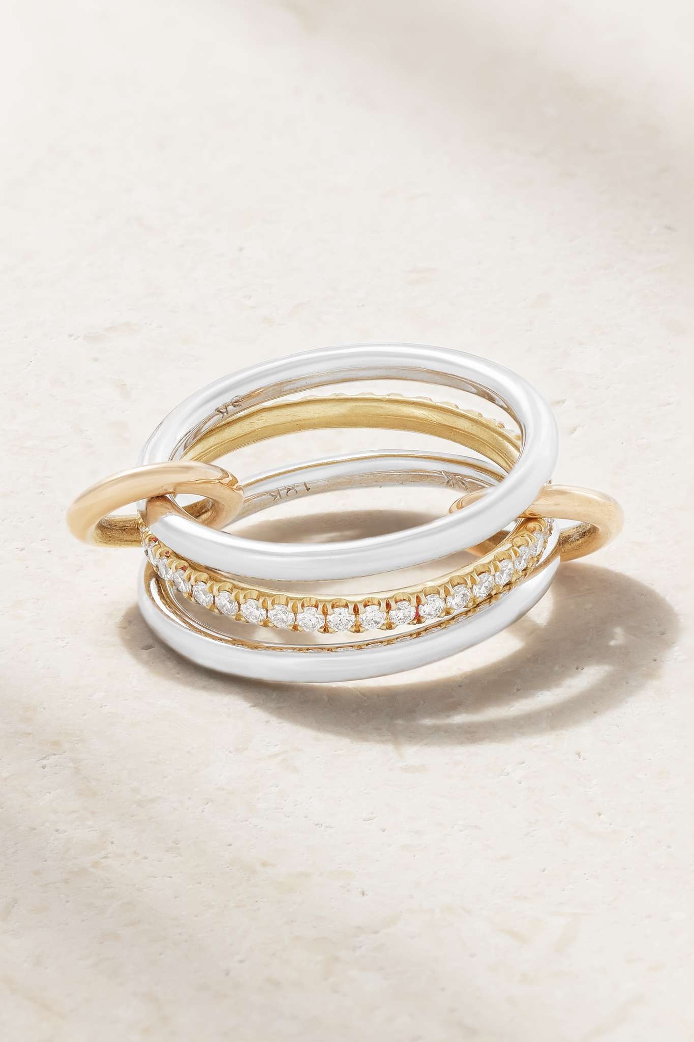 EDITORS'NOTES Yves Spinelli says his signature 'Galaxy' rings are so individual they choose their owners, and so many have been captivated by their unique construction - Oprah Winfrey, Emily Blunt, and Heidi Klum all own them. This 'Sonny' set includes three 18-karat white and yellow gold bands, one deftly studded with shimmering pavéd diamonds. Thanks to the connecting rose gold links, you can to wear it stacked on one finger or across three.<br><br>Shown here with: [Dries Van Noten Blazer id1128510], [Spinelli Kilcollin Rings id1179559], [Spinelli Kilcollin Earrings id1141358]. SIZE & FIT - US sizing - 1. Wrap a length of string or ribbon around the base of your finger. To ensure the ring fits comfortably, we suggest measuring your knuckle as well. Select a size that will slide on and off your finger easily. - 2. With a pen, mark the point on the string where the ends meet. - 3. Measure the string in millimeters with a ruler. - 4. Choose the closest measurement to the chart below to identify your ring size. DETAILS & CARE - Round brilliant-cut G VS1 diamonds, total weight: 0.50-carats - Come in a designer-stamped box - This piece is handmade and as such may have some small flecks or scratches