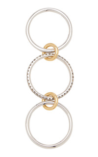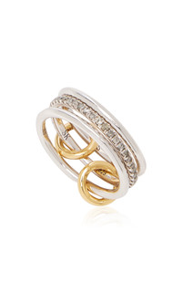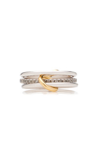 Husband and wife duo Yves Spinelli and Dwyer Kilcollin first gained recognition for their series of interconnecting 'Galaxy' rings that can either be stacked or worn across several fingers — that same innovative design aesthetic inspires their modern jewels to this day. The 'Sonny' ring was forged with simplicity in mind. Its core band of micro pave white diamonds is framed by two outer bands of lucent 18k gold, linked by two richly tonal 18k gold connectors. PRODUCT DETAILS - Composition: .925 sterling silver, 18k yellow gold, grey full-cut pavé-set diamonds (approx. 0.5 tcw) - Made in the USA - Please note the possibility of natural inclusions in gemstones
