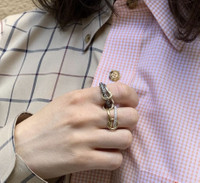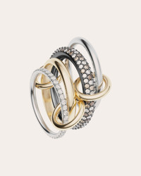 Comprised of four bands in 18k yellow gold and sterling silver, this ring features micro pave-set diamonds in cognac, white, black, and champagne. With a trio of yellow gold connectors, the Vega is a modular design that can be worn a variety of ways. All diamonds are conflict-free for the conscientious wearer. This item is made to order, please allow 2-8 weeks for shipping. This item is final sale. The recycled metal is made exclusively from repurposed solid 18k gold and .925 silver, with conflict free diamonds and gems, exclusively sourced through respected suppliers in adherence with the Kimberley Process and World Diamond Council System of Warranties. Sterling silver, 18k yellow gold, and diamond Diamond: 1.9 tcw Hand polish Made in the USA Size & Fit Pave white diamond band width: 2.3mm Gold band width: 2.7mm Cognac, champagne, and white diamond band width: 3.8mm Sterling silver band width: 1.7mm Sustainability Metrics: Circular Economy: product is intentionally designed with 50% of actively cycled materials Conflict-Free: 100% of products are recycled or conflict-free and adhere to fair trade and labor Craft & Community: at least 75% of products are fully sourced and manufactured within the specified community or country; 100% of production adheres to a fair wage system Read more about Olivela's sustainability pillars here .