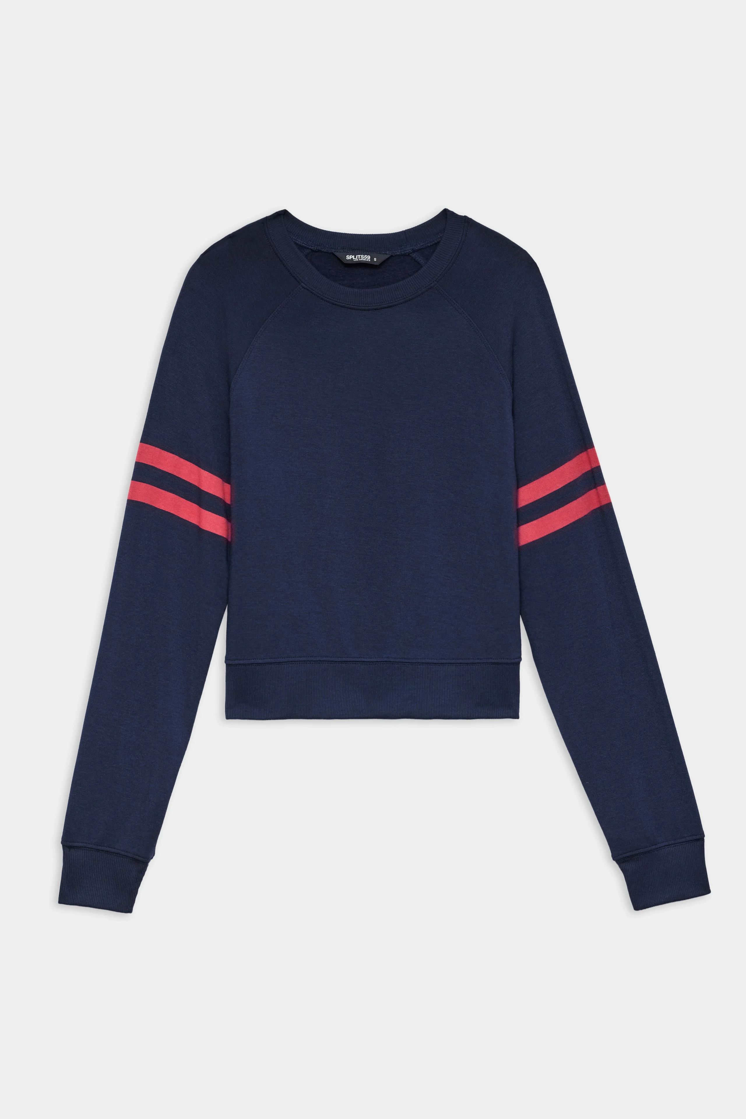 This crewneck pullover gives a nod to the classic college sweatshirt with a sporty update: raglan sleeves featuring two bold stripes, paired with ribbed hem and cuffs. The drape-stretch modal fabric flows beautifully and supports your shape with softness and versatility. MADE IN LOS ANGELES to minimize our carbon footprint. BEST FOR: Warming up and cooling down after running, yoga, CrossFit, barre, Pilates, cycling and spin class. Model Stats: Height: 5’9”, Bust: 34”, Waist: 23.5”, Hips: 34.5” Wearing size: Small THE FIT LUXE FLEECE: 95% Modal/ 5% spandex The finest TENCEL™ Modal fibers are produced with Micro technology for a softer touch. And made with at least 50% less carbon emissions and water consumption. Ultra luxe fleece