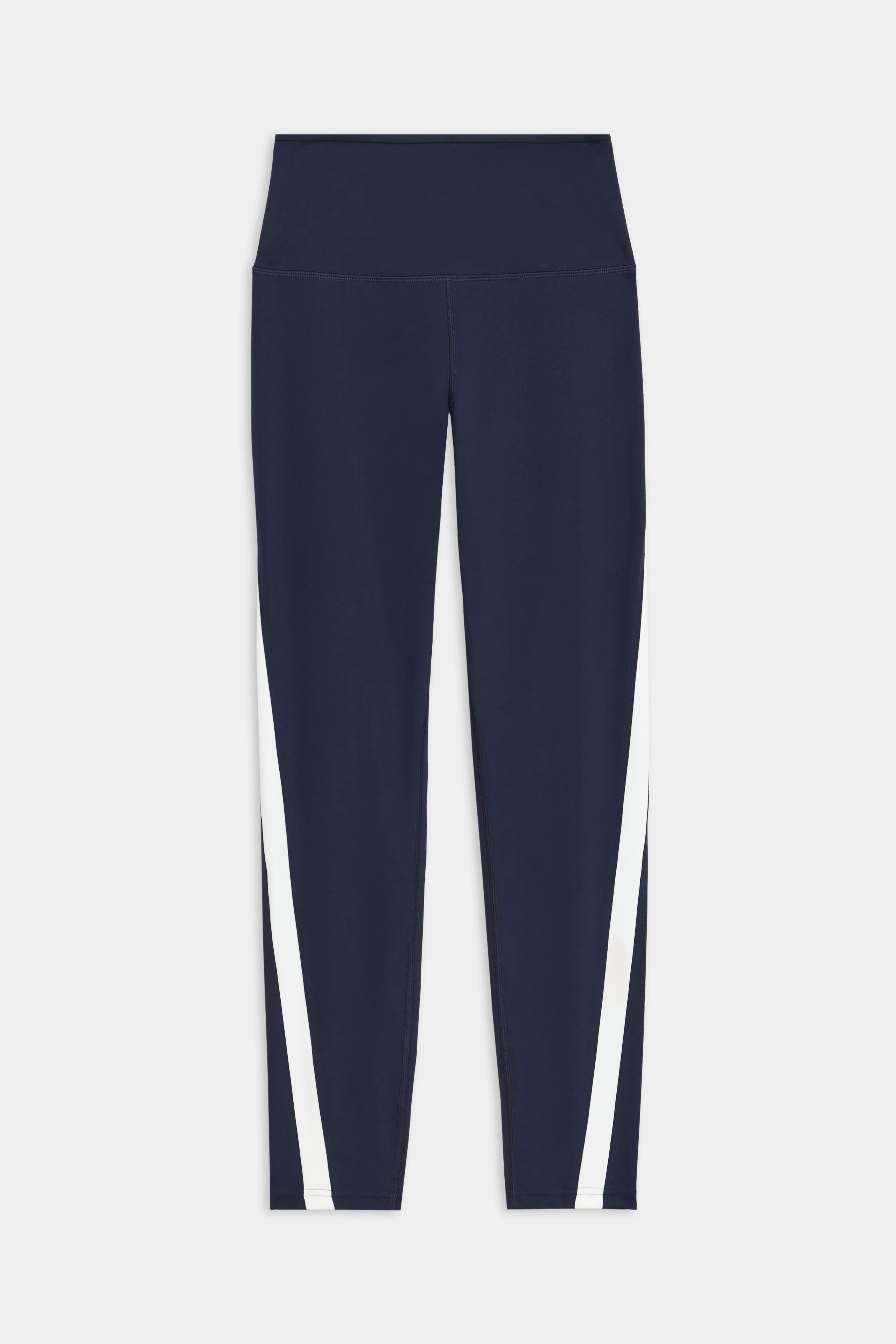 A contrast color stripe wraps from hip to ankle on this classic legging in our luxurious form fitting Rigor fabric. Pair it with the matching Miles Rigor Bra. BEST FOR: Running, yoga, CrossFit, barre, Pilates, spin class, cycling, court sports and gym workouts. Model is 5'9, waist 24", hip 34" and wears a size S THE FIT RIGOR: 62% Nylon/38% Spandex Moisture wicking & Quick-dry technology.