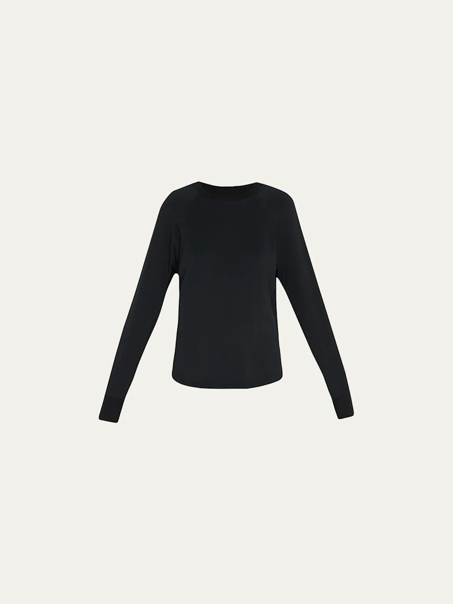 Splits59 "Warm Up" sweatshirt in soft, stretch modal fleece Crew neckline Long raglan sleeves Relaxed fit Shirttail hem Pullover style Modal/spandex Made in USA Model is 5'10"/177cm. Online Inquiries: BGS21_T3VEM| Store Inquiries: #4380476