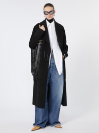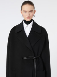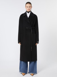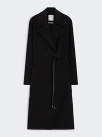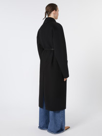 DETAILS Long coat with a dressing gown construction, in a soft double wool The construction features an asymmetrical note on the right side, where the belt passes internally. Pure wool double drap wrap coat Wide lapel collar Closure with tubular belt and asymmetrical detail on the right Large side patch pockets Wide fit COMPOSITION AND CARE Coat fabric 100% virgin wool; - except joining thread; with belt in polyester with polyurethane coating. Coat: do not wash; do not bleach; do not tumble dry; cool iron; professionally dry clean perchloroethylene - mild process; do not wet clean. Belt: do not wash; do not bleach; do not tumble dry; do not iron; do not dry clean; do not wet clean. Distributed by Max Mara S.r.l., registered office in Reggio Emilia (Italy), Via Giulia Maramotti 4, 42124 (IT)