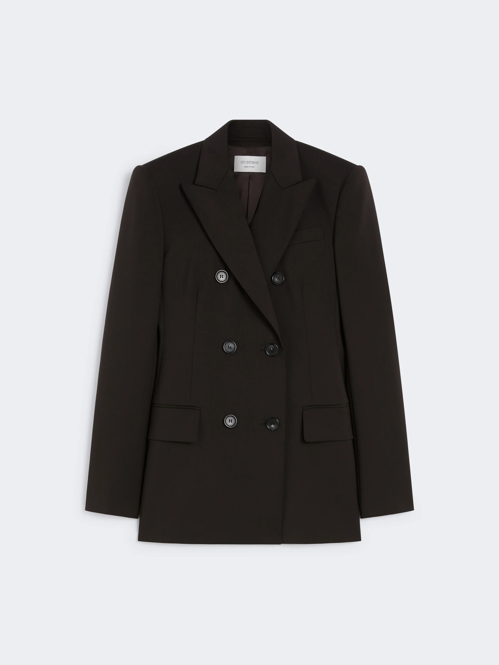 DETAILS Double-breasted blazer with tailored construction, with darts and side panels that outline a feminine silhouette. The peak lapel and slanted pocket recall men's models. Tailored blazer in pure natural stretch wool canvas with internal lining Fitted Collar with peak lapels Double-breasted closure with visible buttons Flapped side pockets Regular fit COMPOSITION AND CARE Fabric 100% virgin wool; lining 70% acetate, 30% polyester; sleeves lining 97% viscose, 3% acetate. Do not wash; do not bleach; do not tumble dry; cool iron; professionally dry clean perchloroethylene - mild process; do not wet clean.; put this item into a string bag before washing it.; wash the garment while it is fastened. Distributed by Max Mara S.r.l., registered office in Reggio Emilia (Italy), Via Giulia Maramotti 4, 42124 (IT)