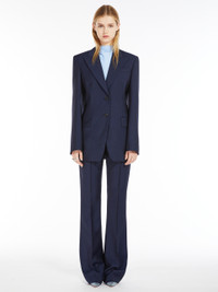 DETAILS Flared slim-fit trousers in wool-blend canvas. The menswear model-inspired design boasts a concealed fastening, belt loop detail on the waistband, slant side pockets and welt rear pockets. Branded internal waistband detail. COMPOSITION AND CARE 46% virgin wool, 30% mohair, 24% polyester. Do not wash; do not bleach; do not tumble dry; cool iron; professionally dry clean perchloroethylene - mild process; do not wet clean. Distributed by Max Mara S.r.l., registered office in Reggio Emilia (Italy), Via Giulia Maramotti 4, 42124 (IT)