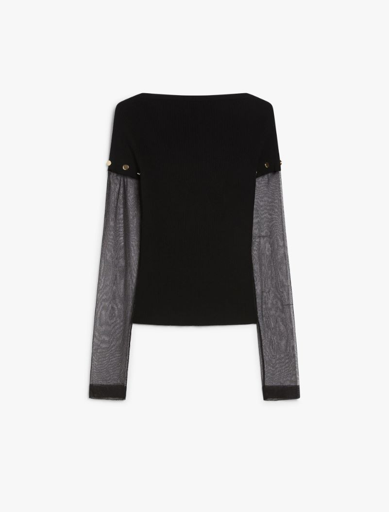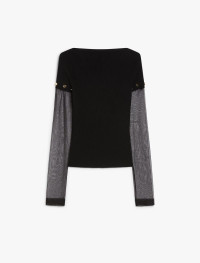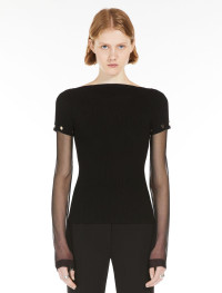 Fitted, feminine jumper made of stretch viscose with a boat neckline. The transparent viscose sleeves can be removed through small customised buttons. Drop-stitching on the front outlines the line of the bust. Regular fit. Composition and Care Knitted fabric 1 72% viscose, 28% polyester; knitted fabric 2 83% viscose, 17% polyamide. Hand wash cold (40°c max); do not bleach; do not tumble dry; flat drying in the shade; cool iron; professionally dry clean perchloroethylene - mild process; do not wet clean.; iron with a cloth between.; using neutral detergent.; protect buttons before washing. Distributed by Max Mara S.r.l., registered office in Reggio Emilia (Italy), Via Giulia Maramotti 4, 42124