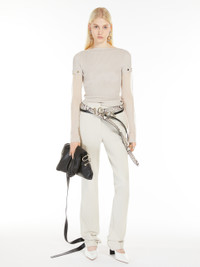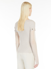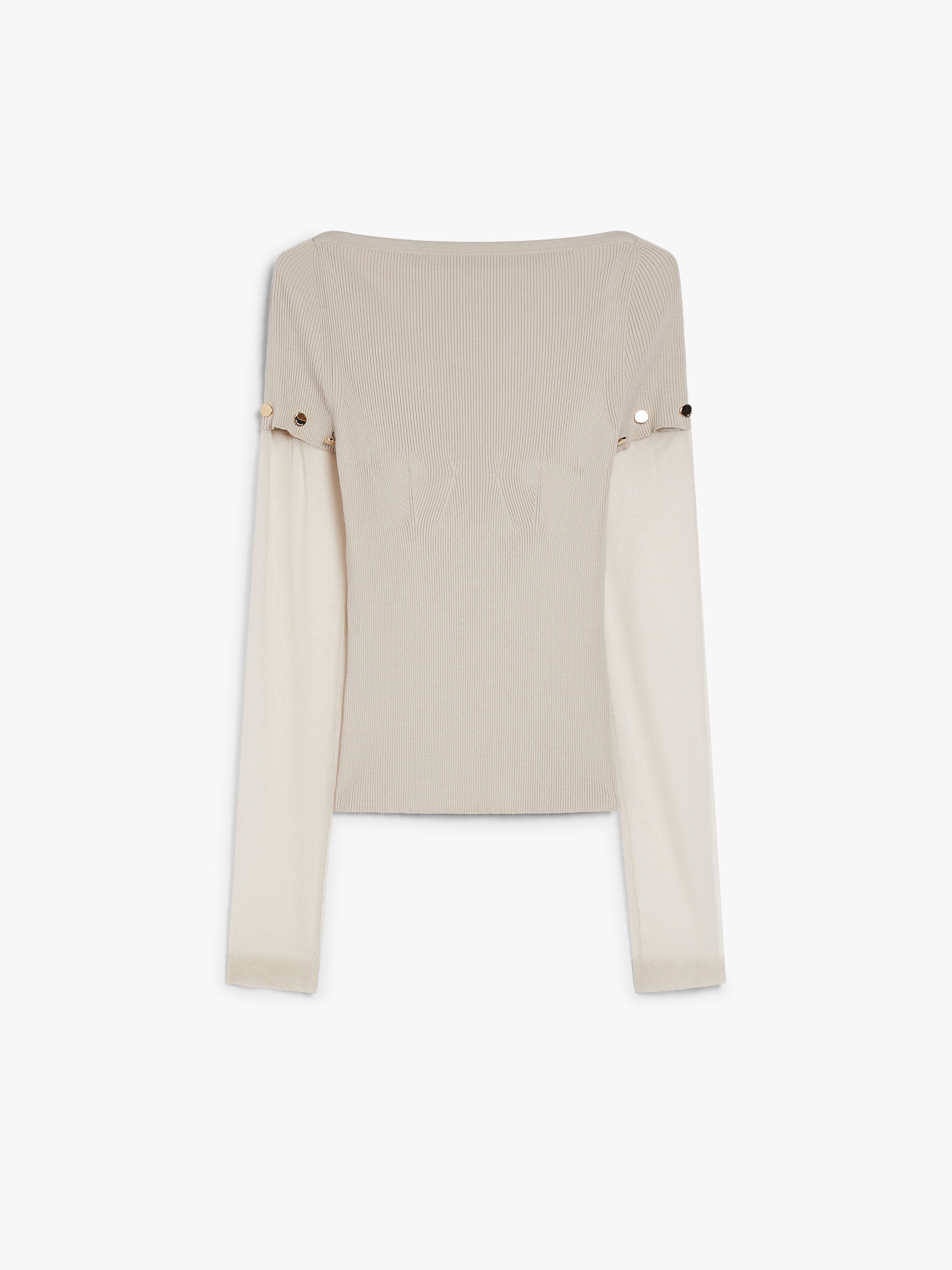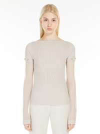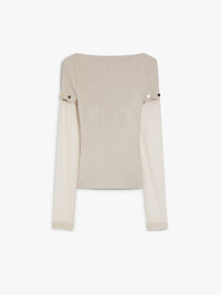 DETAILS Fitted, feminine jumper made of stretch viscose with a boat neckline. The transparent viscose sleeves can be removed through small customised buttons. Drop-stitching on the front outlines the line of the bust. COMPOSITION AND CARE Knitted fabric 1 72% viscose, 28% polyester; knitted fabric 2 83% viscose, 17% polyamide. Hand wash cold; do not bleach; do not tumble dry; flat drying in the shade; cool iron; professionally dry clean perchloroethylene - mild process; do not wet clean.; iron with a cloth between.; using neutral detergent.; protect buttons before washing. Distributed by Max Mara S.r.l., registered office in Reggio Emilia (Italy), Via Giulia Maramotti 4, 42124 (IT)