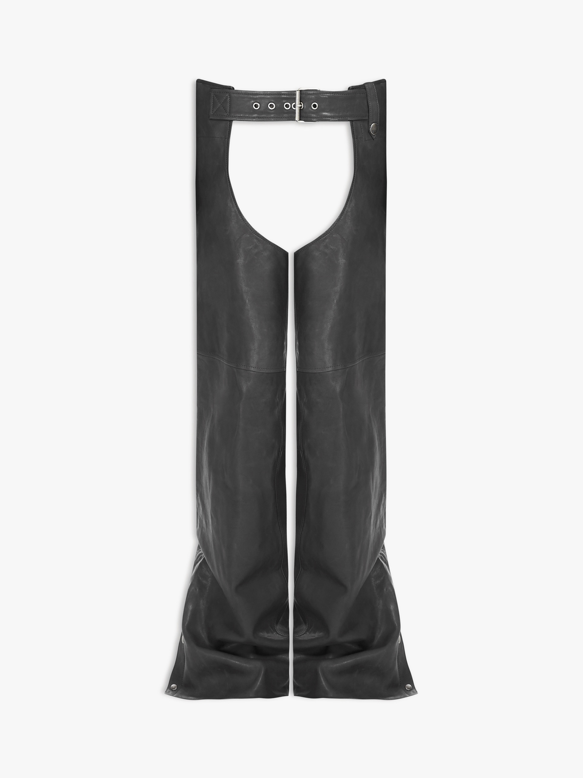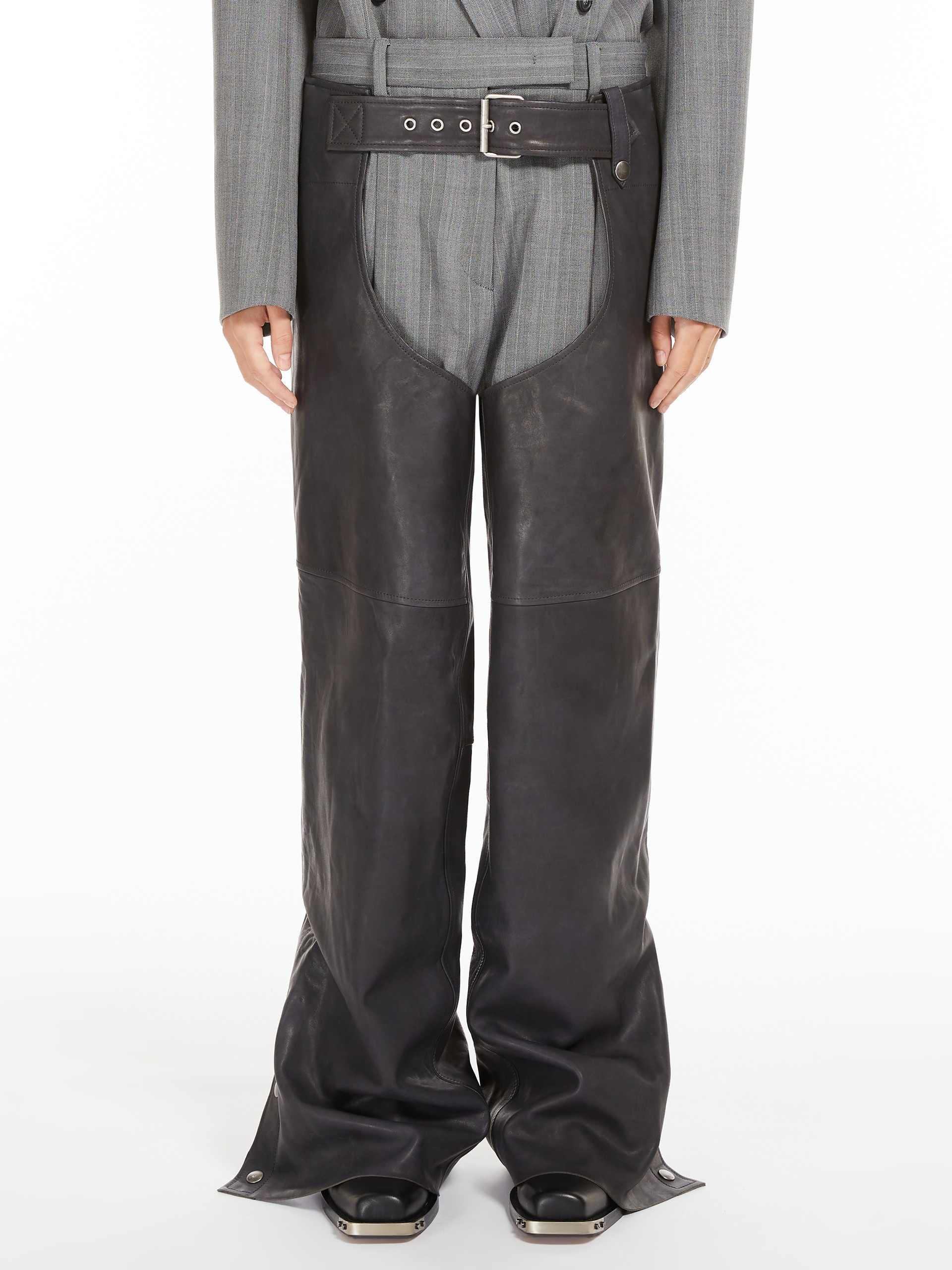 DETAILS Chaps made of nappa leather inspired by equestrian styles. The adjustable buckle at the waist and side openings ensure they are easy and comfortable to slip into. COMPOSITION AND CARE Lamb leather. Do not wash; do not bleach; do not tumble dry; do not iron; do not dry clean; do not wet clean.; do not wash or dry clean by fabric methods. clean only by leather and fur specialists.; care should be taken with light-coloured garments and accessories because body heat could lead the leather to colour loss and staining. care should be taken when sitting on light-coloured surfaces, especially if damp. avoid lengthy exposure to direct light or heat sources. do not store garments in plastic bags for long periods. Distributed by Max Mara S.r.l., registered office in Reggio Emilia (Italy), Via Giulia Maramotti 4, 42124 (IT)
