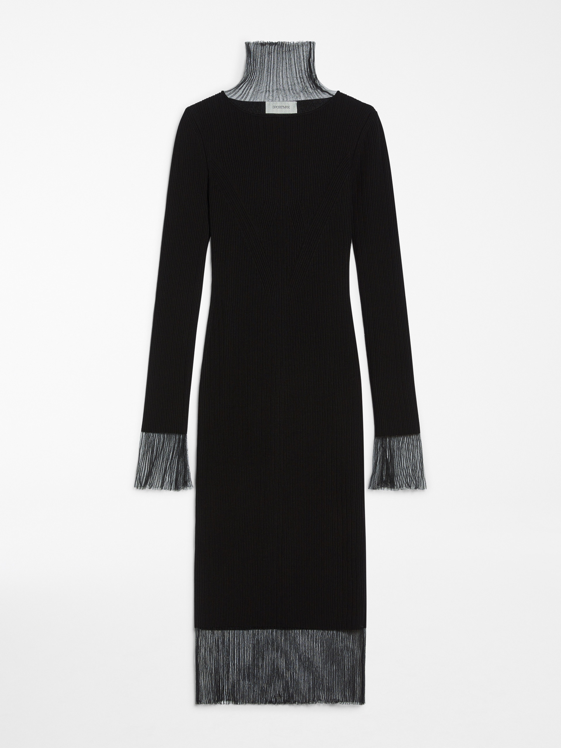 DETAILS Pure wool knit dress featuring a silhouette-defining and femininity-bestowing directional rib-knit pattern. The naturally snug model boasts a high neck and contrasting sheer yarn hems which create a high-cut band. Mid-calf length. COMPOSITION AND CARE Knitted fabric 80% virgin wool, 19% polyamide, 1% elastane; hems 100% polyamide. Do not wash; do not bleach; do not tumble dry; cool iron; professionally dry clean perchloroethylene - mild process; do not wet clean.; iron with a cloth between. Distributed by Max Mara S.r.l., registered office in Reggio Emilia (Italy), Via Giulia Maramotti 4, 42124 (IT)