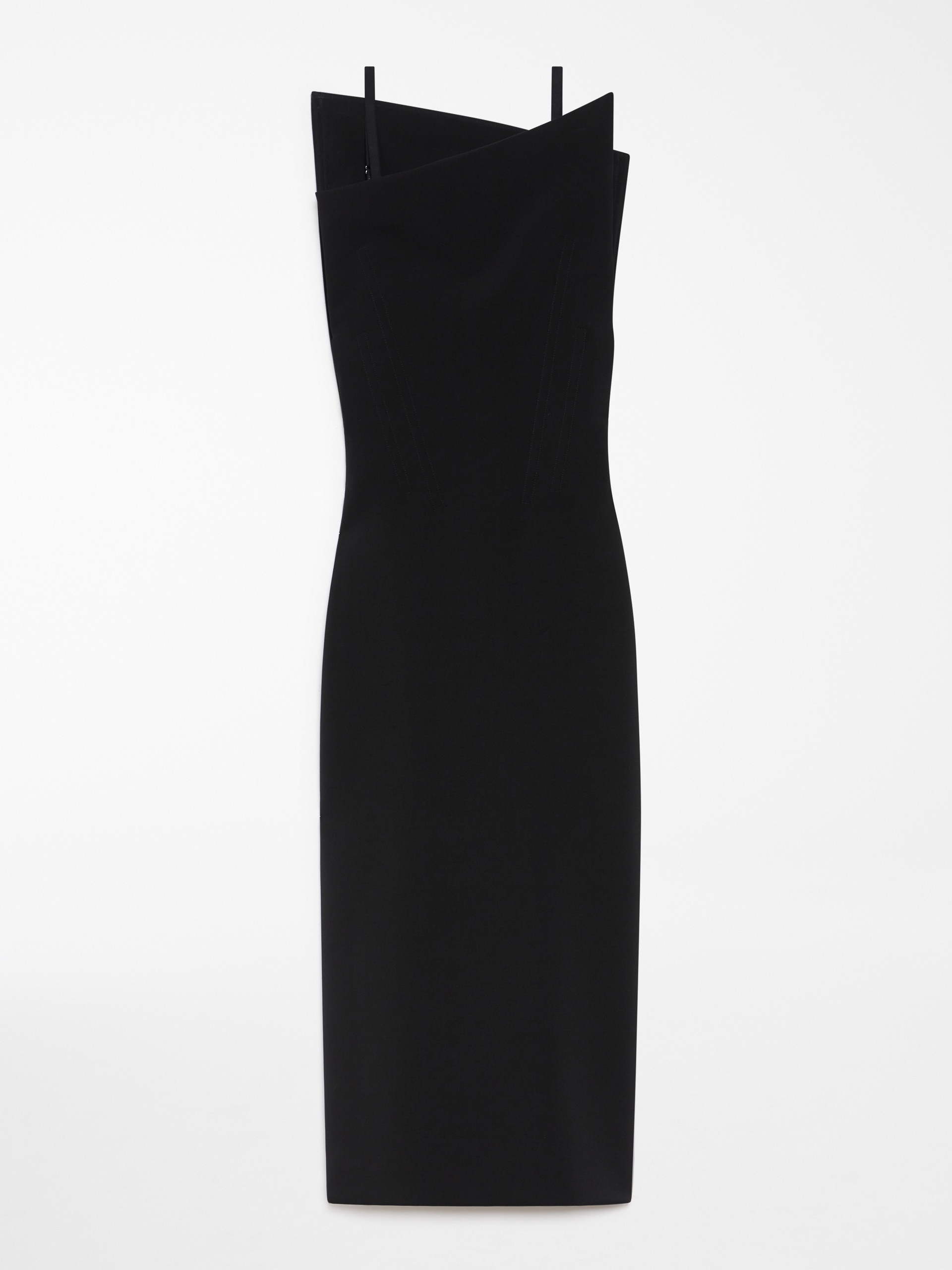 DETAILS Dress in stretch wool double canvas, with deconstructed asymmetric neckline that tapers to a point. The sleeveless style has a bustier bodice with darts, three-dimensional stays and side openings held together by a stretch band. A zip on the left side, a right-side slit and lining complete the piece. COMPOSITION AND CARE 35% polyester, 30% polyamide, 27% virgin wool, 8% elastane. Do not wash; do not bleach; do not tumble dry; cool iron; professionally dry clean perchloroethylene - mild process; do not wet clean.; wash the garment while it is fastened.; remove the straps before washing. Distributed by Max Mara S.r.l., registered office in Reggio Emilia (Italy), Via Giulia Maramotti 4, 42124 (IT)