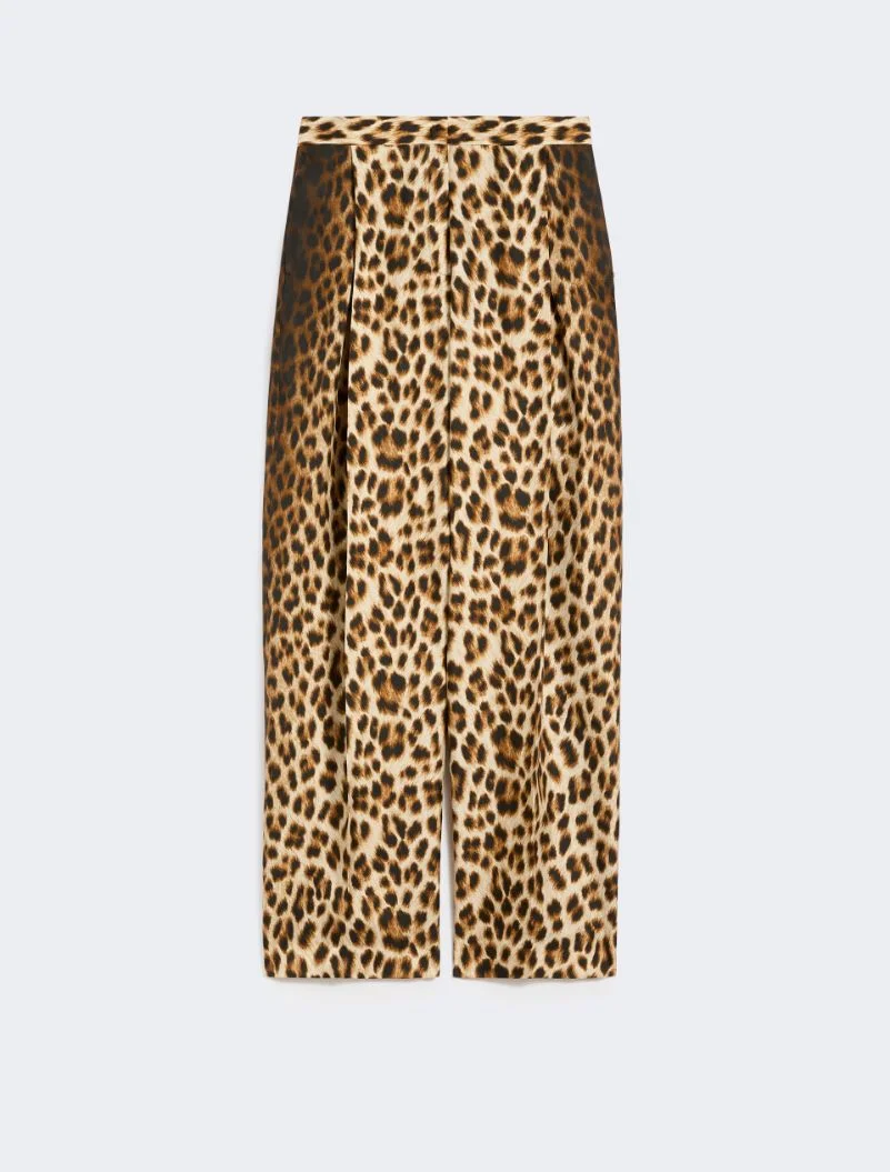 Pure silk twill trousers with a bold animal print. The mannish model-inspired design boasts a branded internal waistband and straight waist cut that widens at the hem. - Pure silk twill trousers with an animal-print pattern - Slim-cut at the waist and a relaxed leg cut - Covered fastening - Front pleats, and pressed pleat detail on the front and back - In-seam side pockets and welt rear pockets - Regular fit Composition and Care 100% silk. Do not wash; do not bleach; do not tumble dry; cool iron; professionally dry clean perchloroethylene - mild process; do not wet clean. Distributed by Max Mara S.r.l., registered office in Reggio Emilia (Italy), Via Giulia Maramotti 4, 42124