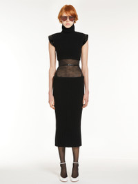 DETAILS Dress made in a ribbed cashmere-blend knit. The sleeveless design features a high neck and an extended shoulder line. The bodice of the garment is joined to the skirt only on the back, creating a two-piece effect with a cropped line on the front. The style is completed by a sheer yarn bodysuit with long sleeves. COMPOSITION AND CARE Knitted dress 70% virgin wool, 30% cashmere. Knitted body 62% wool, 26% acrylic, 12% polyamide. Knitted dress: hand wash cold; do not bleach; do not tumble dry; flat drying in the shade; cool iron; professionally dry clean perchloroethylene - mild process; do not wet clean.; Iron with a cloth between.; Using neutral detergent. Knitted body: hand wash cold; do not bleach; do not tumble dry; flat drying in the shade; cool iron; professionally dry clean perchloroethylene - mild process; do not wet clean.; Iron with a cloth between.; Using neutral detergent. Distributed by Max Mara S.r.l., registered office in Reggio Emilia (Italy), Via Giulia Maramotti 4, 42124 (IT)