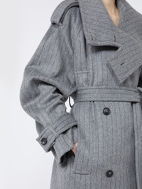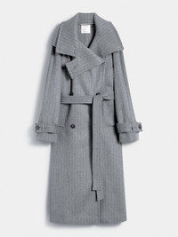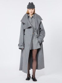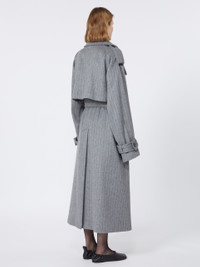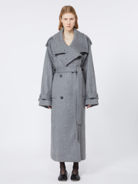 DETAILS Trench coat in soft, pure wool double cloth, with a wide collar that can be closed with buttons and buttonholes. The loose volumes are tightened at the waist with a matching belt. Trench coat in yarn-dyed pure wool double cloth with pinstripe pattern Loose fit Wide lapel neckline completed with buttonholes and buttons Double-breasted closure with visible buttons Epaulettes on shoulders and straps at the wrists Wide fit COMPOSITION AND CARE Fabric 100% virgin wool; - except joining thread. Do not wash; do not bleach; do not tumble dry; cool iron; professionally dry clean perchloroethylene - mild process; do not wet clean.; put this item into a string bag before washing it.; wash the garment while it is fastened.; turn the articles inside out before washing. Distributed by Max Mara S.r.l., registered office in Reggio Emilia (Italy), Via Giulia Maramotti 4, 42124 (IT)