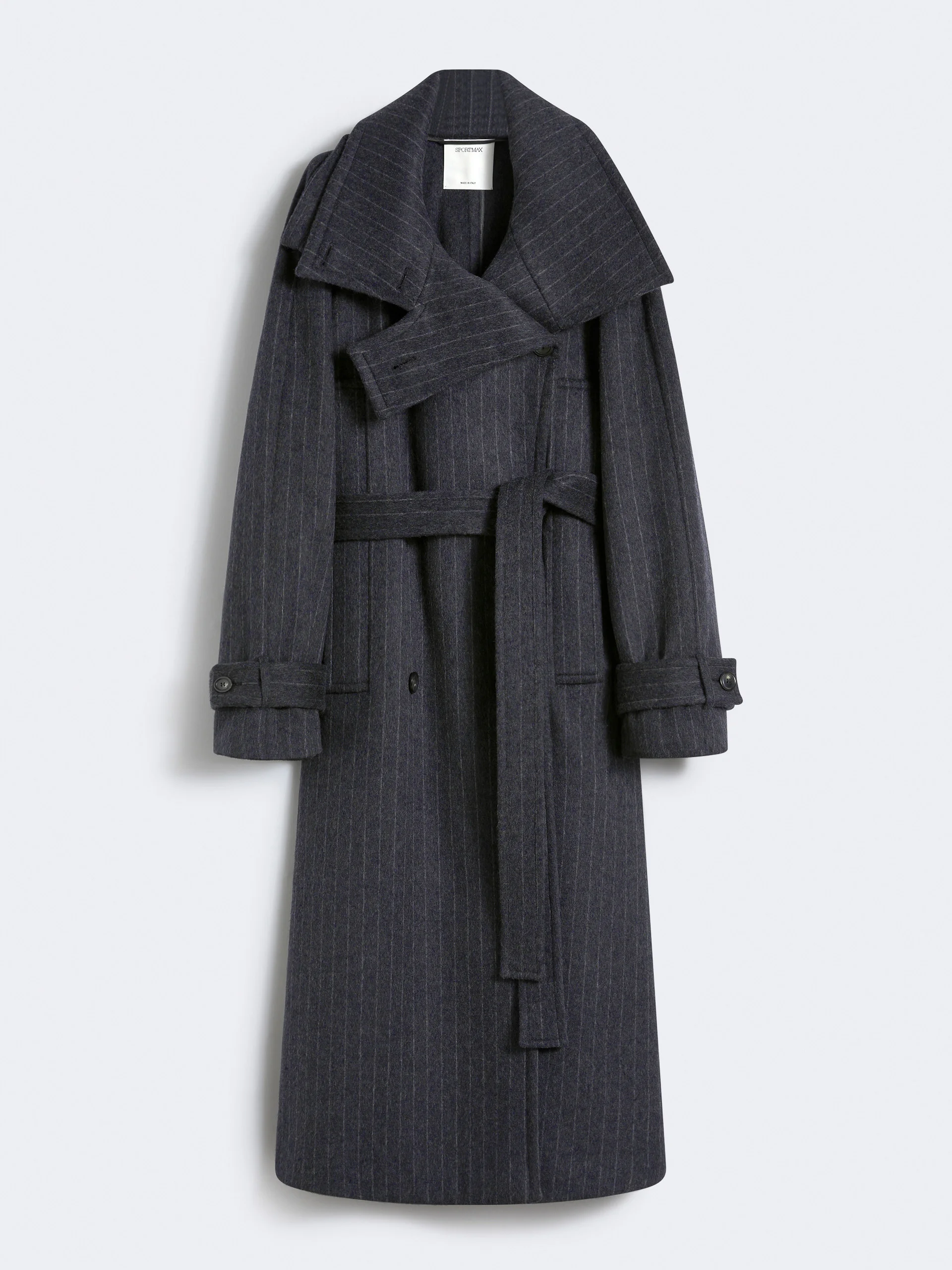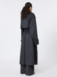 DETAILS Trench coat in soft, pure wool double cloth, with a wide collar that can be closed with buttons and buttonholes. The loose volumes are tightened at the waist with a matching belt. Trench coat in yarn-dyed pure wool double cloth with pinstripe pattern Loose fit Wide lapel neckline completed with buttonholes and buttons Double-breasted closure with visible buttons Epaulettes on shoulders and straps at the wrists Wide fit COMPOSITION AND CARE Fabric 100% virgin wool; - except joining thread. Do not wash; do not bleach; do not tumble dry; cool iron; professionally dry clean perchloroethylene - mild process; do not wet clean.; put this item into a string bag before washing it.; wash the garment while it is fastened.; turn the articles inside out before washing. Distributed by Max Mara S.r.l., registered office in Reggio Emilia (Italy), Via Giulia Maramotti 4, 42124 (IT)
