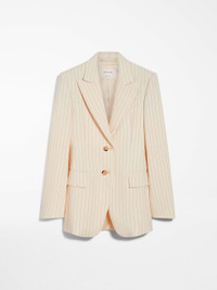 DETAILS Blazer with a tailored construction, made of yarn-dyed ramie and viscose fabric. Feminine and form-fitting, with darts and shaped side panels to define the silhouette. The style has a peak lapel and melton detail collar, side pockets with flap and double welt, overlapping central rear slit. Lined. COMPOSITION AND CARE Fabric 58% ramie, 38% viscose, 3% elastane, 1% polyester; lining 70% acetate, 30% polyester; sleeves lining 97% viscose, 3% acetate. Do not wash; do not bleach; do not tumble dry; cool iron; professionally dry clean perchloroethylene - mild process; do not wet clean.; wash the garment while it is fastened.; don’t iron the labels.; turn the articles inside out before washing. Distributed by Max Mara S.r.l., registered office in Reggio Emilia (Italy), Via Giulia Maramotti 4, 42124 (IT)