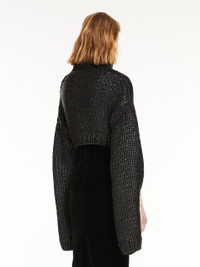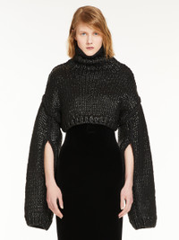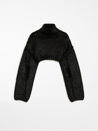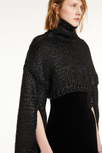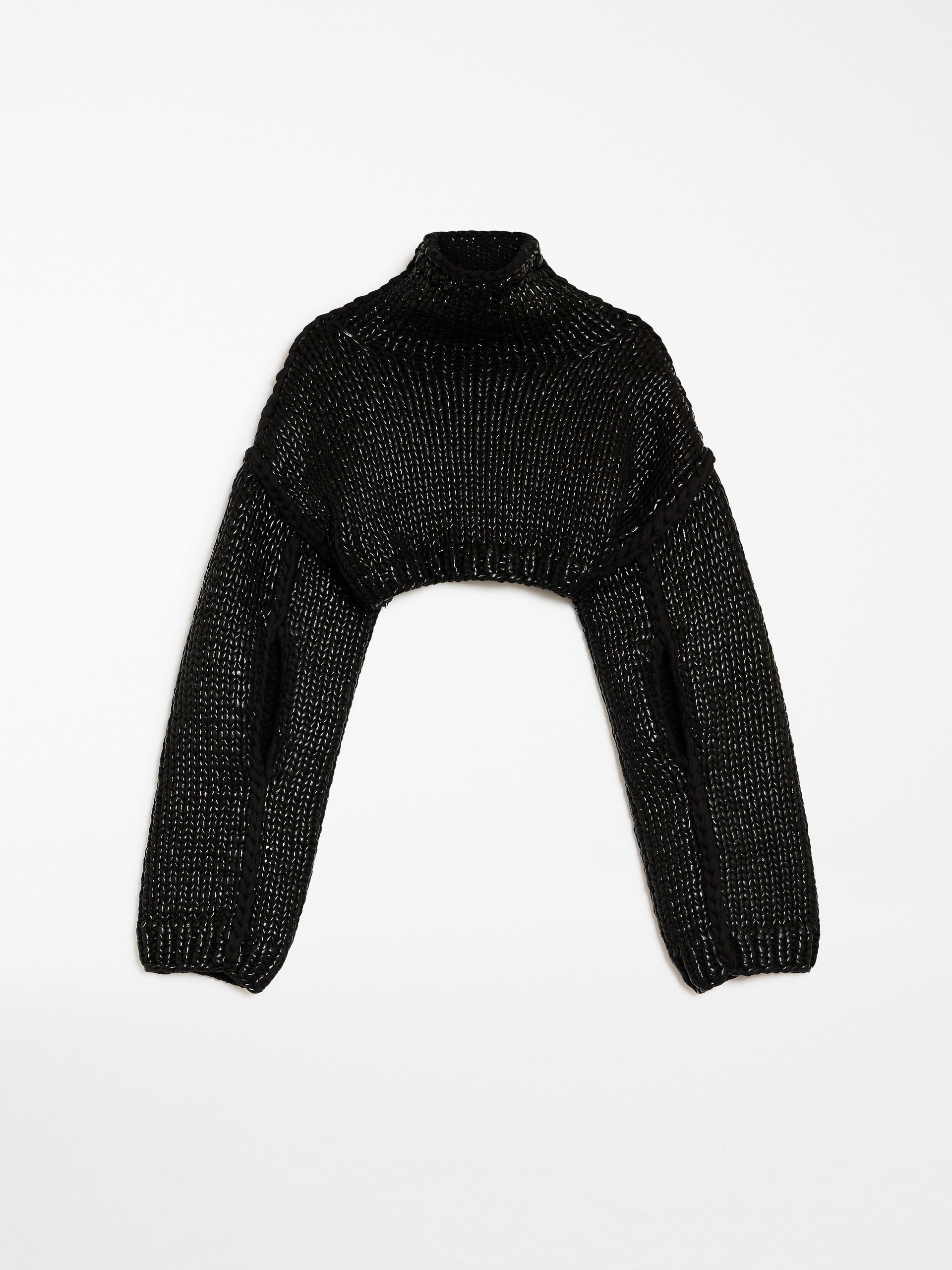 DETAILS Jumper cropped to the waistline, made of a cotton-blend cordonnet that is coated for a semi-sheen look. The original design features a high neck, very dropped shoulders and keyhole cutaway for the arms. The uncoated thread embroidery detail on the shoulder, armhole and sleeve creates a contrasting embellishment. COMPOSITION AND CARE Knitted fabric 76% cotton, 24% polyamide; - exclusive of decorative yarns, exclusive of coating. Hand wash cold; do not bleach; do not tumble dry; flat drying in the shade; cool iron; do not dry clean; do not wet clean.; iron with a cloth between.; using neutral detergent. Distributed by Max Mara S.r.l., registered office in Reggio Emilia (Italy), Via Giulia Maramotti 4, 42124 (IT)