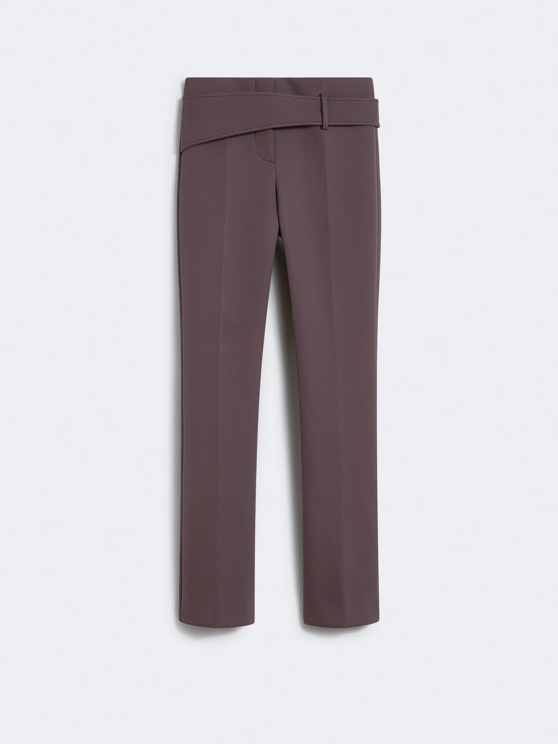 DETAILS Slightly low-waisted trousers, with a slim leg and a rear ankle zip for a delicate flared effect at the hem. The belt applied on the right side hugs the hips asymmetrically, threading into the loop on the left. Wool blend trousers Slim-fit Zip fastening and asymmetrical applied belt detail Trouser crease front and back Zip on the back of the ankle Fitted COMPOSITION AND CARE Outer fabric 55% polyester, 45% virgin wool; inner jersey fabric 100% polyester. Do not wash; do not bleach; do not tumble dry; cool iron; professionally dry clean perchloroethylene - mild process; do not wet clean.; wash the garment while it is fastened. Distributed by Max Mara S.r.l., registered office in Reggio Emilia (Italy), Via Giulia Maramotti 4, 42124 (IT)