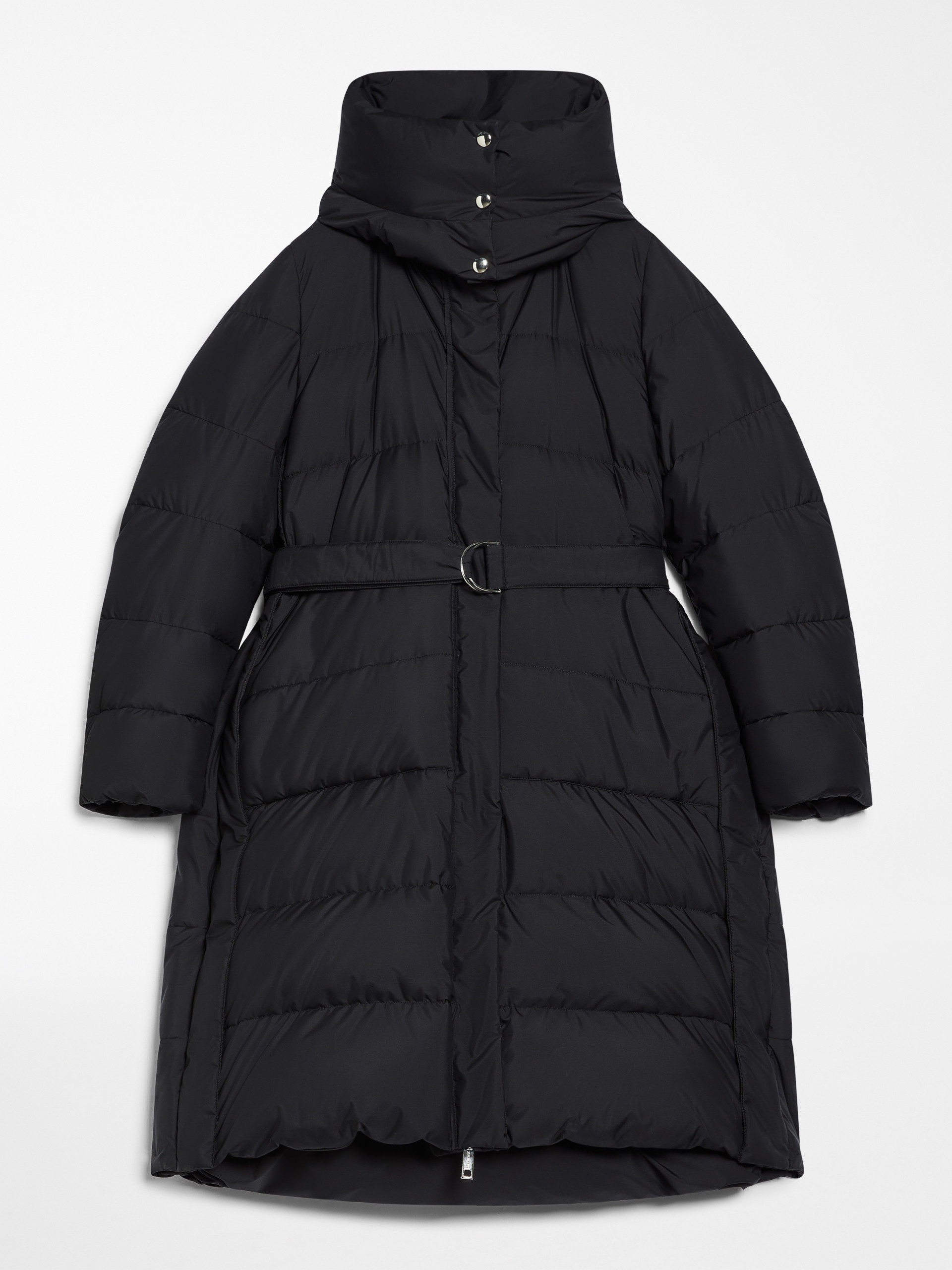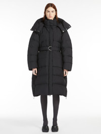 DETAILS Long cocoon-line down jacket in water-repellent canvas with goose-down padding. The design features horizontal boudin quilting, raised collar and removable hood. The deep slits on the sides can be adjusted thanks to the metal zips and concealed snap buttons. The front fastening is covered and completed by a half belt with buckle that only encircles the front. COMPOSITION AND CARE Fabric 100% polyester; lining 100% polyester; with quilting virgin down. Machine wash cold delicate cycle; do not bleach; tumble dry low; cool iron; line drying in the shade; professionally dry clean hydrocarbons - normal process; do not wet clean.; wash the garment while it is fastened.; turn the articles inside out before washing.; remove the inside braces before washing.; contains non-textile parts of animal origin. Distributed by Max Mara S.r.l., registered office in Reggio Emilia (Italy), Via Giulia Maramotti 4, 42124 (IT)