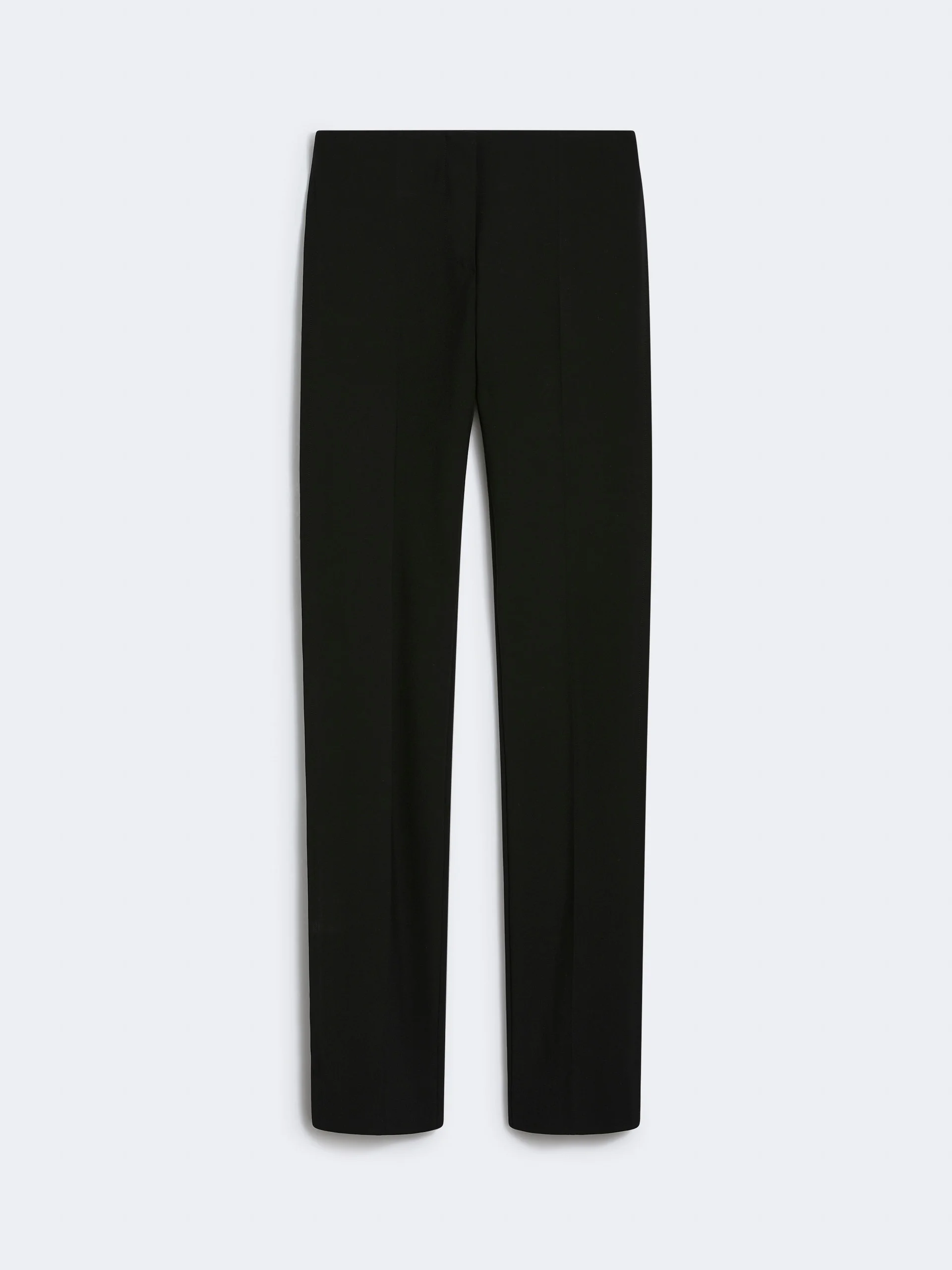 DETAILS Straight-leg trousers with feminine lines, featuring a trouser crease that slims the silhouette and a slit at the back for a delicate flared effect. Decorative metal loops on the front of the waist. Stretch viscose blend trousers Regular fit Concealed hook and zip fastening Small side lip with stitching Trouser crease on front and back with ankle slit Regular fit COMPOSITION AND CARE 56% viscose, 34% polyamide, 10% elastane. Hand wash cold (40°c max); do not bleach; do not tumble dry; line drying in the shade; cool iron; professionally dry clean perchloroethylene - mild process; do not wet clean.; wash the garment while it is fastened. Distributed by Max Mara S.r.l., registered office in Reggio Emilia (Italy), Via Giulia Maramotti 4, 42124 (IT)