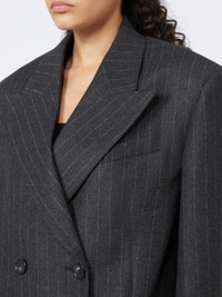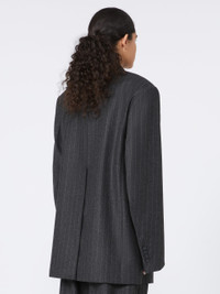 DETAILS Menswear-inspired blazer with straight lines over the torso and an oversized volume. The inspiration from menswear classics can be seen in the pinstripe pattern and the structured details, such as the breast pocket and the flap and welt pockets. Blazer in a stretch fabric made of a wool and viscose blend Oversize fit Collar with peak lapels Double-breasted closure with visible buttons Side pockets with flap and welt Regular fit COMPOSITION AND CARE Fabric 44% virgin wool, 40% viscose, 14% polyamide, 2% elastane; lining 70% acetate, 30% polyester; sleeves lining 97% viscose, 3% acetate. Do not wash; do not bleach; do not tumble dry; cool iron; professionally dry clean perchloroethylene - mild process; do not wet clean.; wash the garment while it is fastened.; protect buttons before washing. Distributed by Max Mara S.r.l., registered office in Reggio Emilia (Italy), Via Giulia Maramotti 4, 42124 (IT)