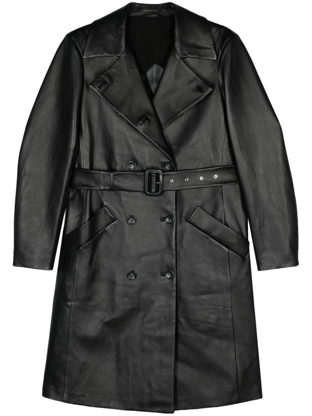 belted leather trench coat Highlights - Black - Lambskin - Wide notch lapels - Double-breasted button fastening - Belted waist - Shoulder pads - Long sleeves - Two side welt pockets - Central rear vent - Straight hem - Mid-length - Partial lining Made in Italy Composition Lining: Polyester 97%, Elastane 3% Outer: Lamb Skin 100%