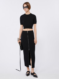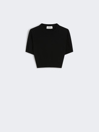 DETAILS Stretch viscose yarn sweater with a feminine line and cropped length at the waist. Dropped details on the neckline and armhole, with ribbed edges. Stretch viscose jumper Feminine, fitted style. Crew neckline Edges and hem of garment in ribbed knit. Dropped details Fitted COMPOSITION AND CARE 70% viscose, 30% polyester. Hand wash cold (40°c max); do not bleach; do not tumble dry; flat drying in the shade; cool iron; professionally dry clean perchloroethylene - mild process; do not wet clean.; iron with a cloth between.; using neutral detergent. Distributed by Max Mara S.r.l., registered office in Reggio Emilia (Italy), Via Giulia Maramotti 4, 42124 (IT)
