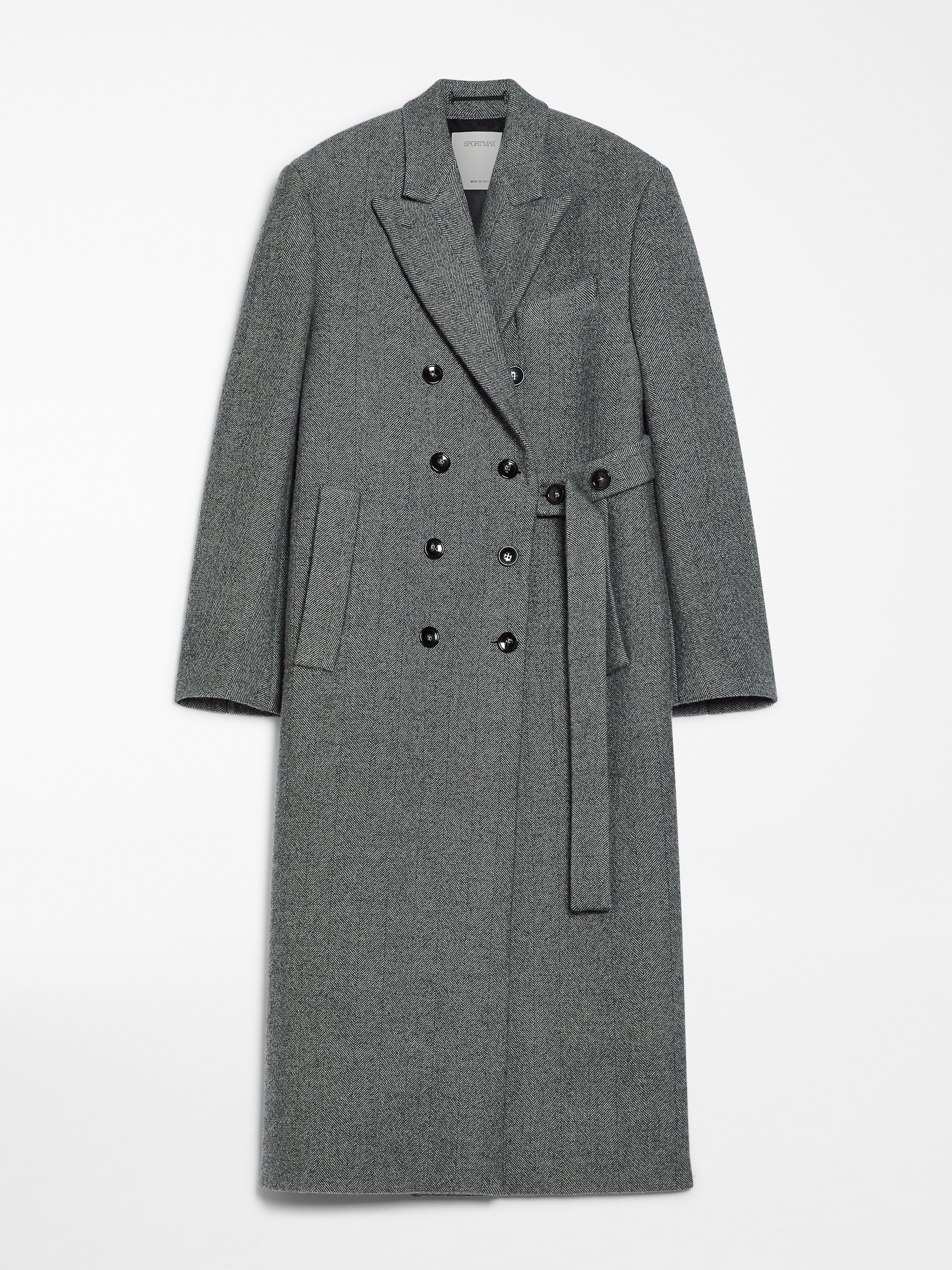 DETAILS Herringbone-patterned coat in double-faced wool-blend broadcloth. The double-breasted model boasts visible horn-look buttons and an asymmetrical belt fastening which cinches the left side and back of the garment before slotting into the opposite side. Lined garment. The belt can also be worn in the traditional way. COMPOSITION AND CARE Fabric 80% virgin wool, 20% polyamide; - except joining thread; lining 50% acetate, 50% viscose. Do not wash; do not bleach; do not tumble dry; cool iron; professionally dry clean perchloroethylene - mild process; do not wet clean.; put this item into a string bag before washing it.; wash the garment while it is fastened. Distributed by Max Mara S.r.l., registered office in Reggio Emilia (Italy), Via Giulia Maramotti 4, 42124 (IT)