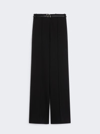 DETAILS Trousers made of soft and comfortable crepe stitch fabric. The model features a high waist with a fabric belt and S-shaped metal buckle. Ribbing on the front and a trouser pleat on the back. Stretch viscose blend trousers Slightly flared line at the hem, with high waist Menswear-style hook fastening Belt in matching fabric with S-shaped metal buckle. Ribbing on the front and trouser crease on the back Regular fit COMPOSITION AND CARE 70% viscose, 25% polyamide, 5% elastane. Do not wash; do not bleach; do not tumble dry; cool iron; professionally dry clean perchloroethylene - mild process; do not wet clean.; iron with a cloth between.; before cleaning the style remove the accessories.; remove the belt before washing. Distributed by Max Mara S.r.l., registered office in Reggio Emilia (Italy), Via Giulia Maramotti 4, 42124 (IT)