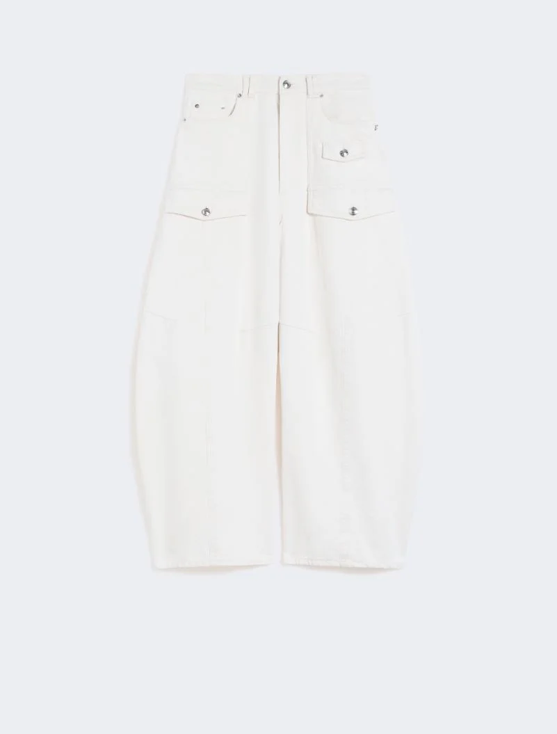 Low-rise, dropped-crotch trousers featuring large utility-style pockets and a curved leg cut. The branded metal buttons add a casual touch. Tone-on-tone stitching motif that highlights the constructive seams and darts. - Garment-washed ecru bull trousers - Vertical darts and tucks at the front - Curved leg cut - Branded label and metal buttons - Regular fit Composition and Care 100% cotton. Machine wash cold delicate cycle; do not bleach; do not tumble dry; line drying in the shade; cool iron; do not dry clean.; wash the garment while it is fastened.; turn the articles inside out before washing.; dyed article. the unevennes of the dye and the pressing form its characteristic.; this item may leave colour stains on brightly-coloured garments.; contains non-textile parts of animal origin. Distributed by Max Mara S.r.l., registered office in Reggio Emilia (Italy), Via Giulia Maramotti 4, 42124