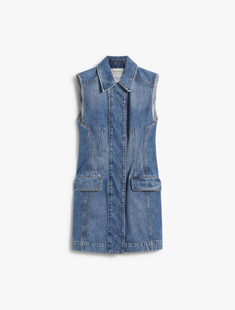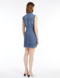 Sleeveless dress in authentic indigo denim with a medium vintage treatment. The darts and shaped sides define the silhouette accentuated by contrasting-coloured stitching. Concealed front fastening with a double row of snap buttons. Flapped side pockets. Fitted. Composition and Care 100% cotton. Machine wash cold delicate cycle; do not bleach; do not tumble dry; line drying in the shade; cool iron; professionally dry clean perchloroethylene - mild process.; take care when wearing light-coloured clothes or accessories because, with the heat of the body, the indigo fabric , may fade and stain. be careful while sitting on light coloured surfaces, especially if wet. wash garments separately and always turned inside out. hang the garment turned inside out by avoiding to expose it to direct sunlight. avoid removing isolated stains. Distributed by Max Mara S.r.l., registered office in Reggio Emilia (Italy), Via Giulia Maramotti 4, 42124