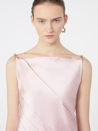 DETAILS Mini dress with a feminine fit, straight neckline and metal chain shoulder straps. Made of bonded satin and diagonally pleated, it is personalized with metal S-shaped ornaments on the front. The back features a pleat on the right that creates a slight movement. Lined mini dress in bonded and pleated technical satin with a diagonal cut Straight fit Straight neckline, with metal chain shoulder straps Metal S-shaped ornaments Pleated motif that hugs the right side from the back Regular fit COMPOSITION AND CARE Fabric 100% polyester; lining 100% polyester. Hand wash cold (40°c max); do not bleach; do not tumble dry; line drying in the shade; do not iron; professionally dry clean perchloroethylene - mild process; do not wet clean.; remove metal parts before washing. Distributed by Max Mara S.r.l., registered office in Reggio Emilia (Italy), Via Giulia Maramotti 4, 42124 (IT)