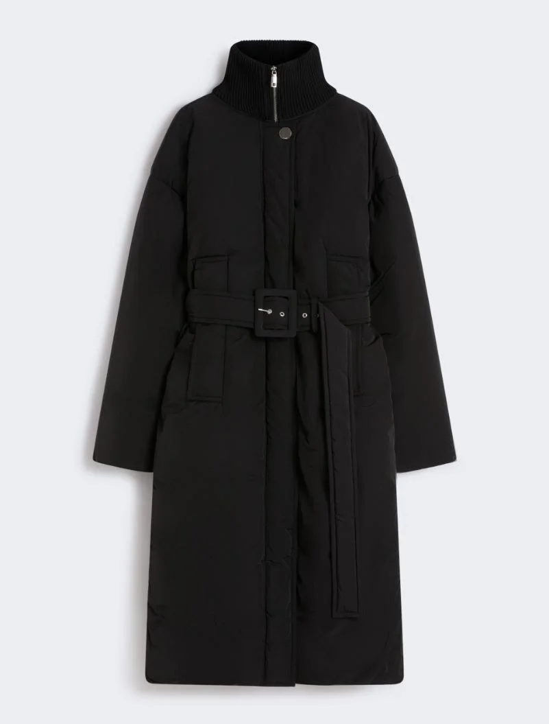 Long, enveloping down jacket, secured at the waist with a matching belt. Raised knit collar and side pockets with large flap. - Water-repellent technical fabric down jacket with crinkle effect and goose down - Straight fit - Raised knit collar - Hidden front zip opening and visible, custom top button. Belt with buckle - Flapped side pockets - Lined - Wide fit Composition and Care Fabric 100% polyamide; lining 100% polyamide; with quilting in 100% polyester; with knitted details 100% polyester; with quilting virgin down. Machine wash cold delicate cycle; do not bleach; do not tumble dry; line drying in the shade; cool iron; professionally dry clean perchloroethylene - mild process.; wash the garment while it is fastened.; turn the articles inside out before washing.; remove the belt before washing.; contains non-textile parts of animal origin. Distributed by Max Mara S.r.l., registered office in Reggio Emilia (Italy), Via Giulia Maramotti 4, 42124