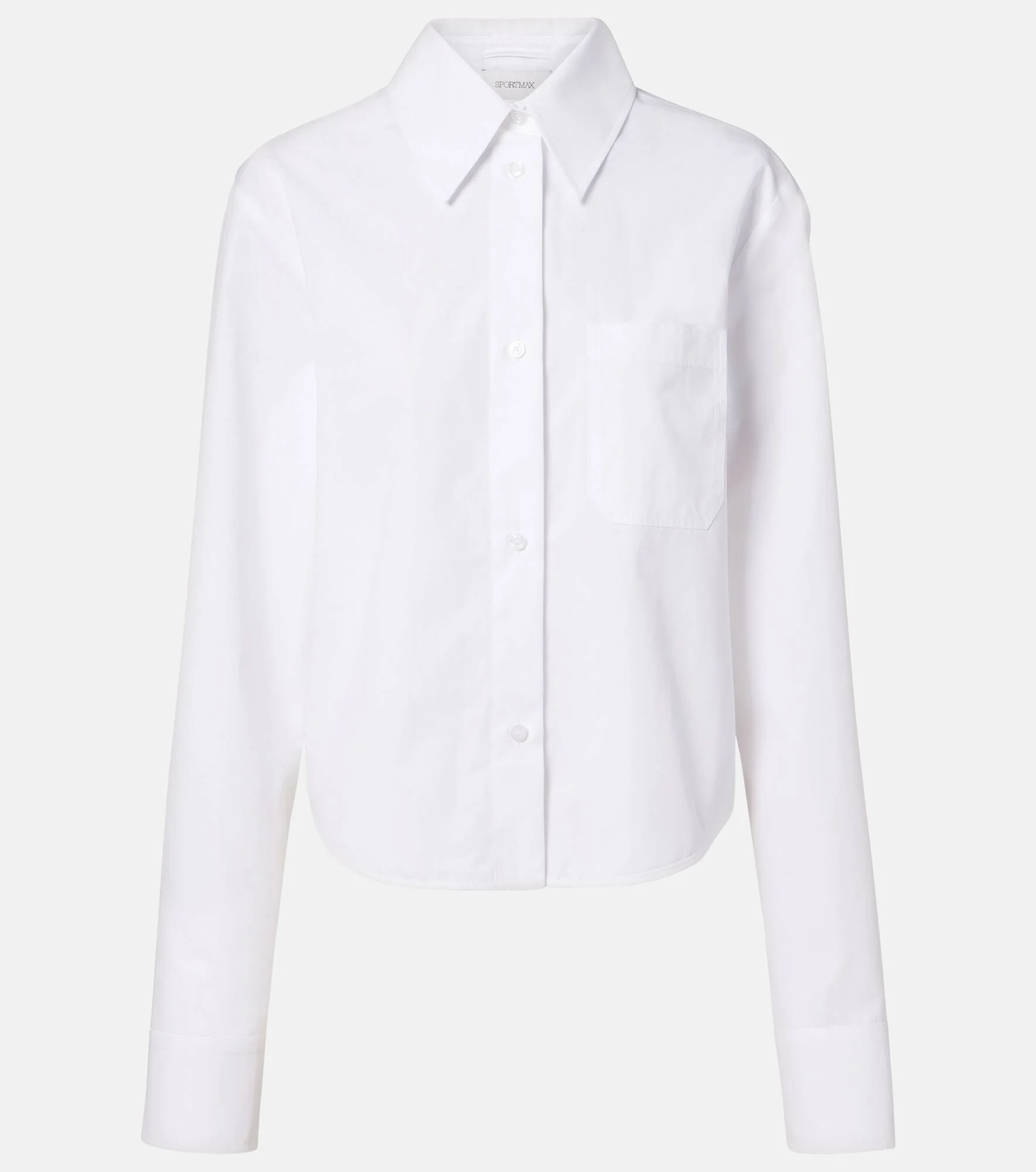 Founded on the principles of tailoring and experimentation, Sportmax combines a contemporary urban spirit with sportswear-inspired silhouettes. The Ceppo shirt is made from a lightweight cotton blend and boasts an elegant pointed collar. Product Details - Material: 77% cotton, 23% polyester - Care instructions: dry clean - Made in Portugal - Color: white - Designer color name: Bianco Ottico - Closure: buttoned placket - Collar: classic (Straight point) - Cuff: three buttons - Item number: P01124179 Size & Fit - True to size - Designed for a loose fit - Non-stretchy fabric - Falls to the hip - The model seen in the picture is 178cm-5'10" and wearing a size DE 34