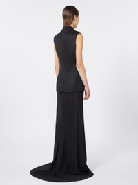 DETAILS Dress with shaped lines, featuring a supported and fitted bodice combined with a flowing crepe skirt. Shaped hips for an hourglass silhouette. Dress with bodice made of heavy duchess satin and skirt in pure silk crepe de Chine Slim-fit at the waist with rounded hips Raised collar with concealed back zip Sleeveless cut Flapped side pockets Flared skirt with train effect Fitted waist COMPOSITION AND CARE Upper part 67% cotton, 33% polyamide; lower part 91% silk, 9% elastane; lining 69% acetate, 31% cupro. Do not wash; do not bleach; do not tumble dry; cool iron; professionally dry clean perchloroethylene - mild process; do not wet clean.; put this item into a string bag before washing it.; iron with a cloth between. Distributed by Max Mara S.r.l., registered office in Reggio Emilia (Italy), Via Giulia Maramotti 4, 42124 (IT)