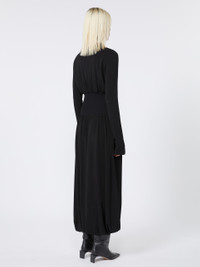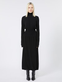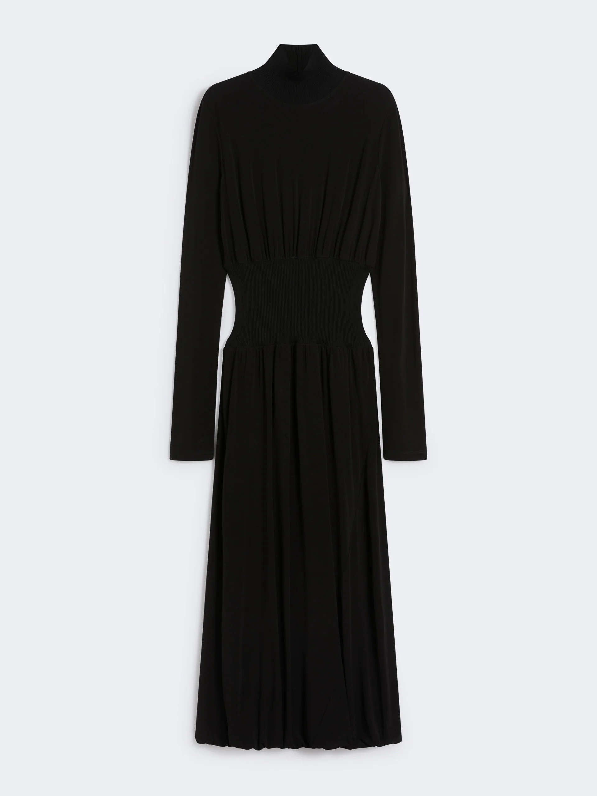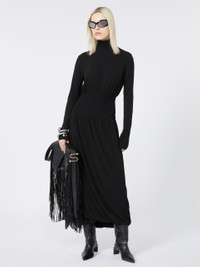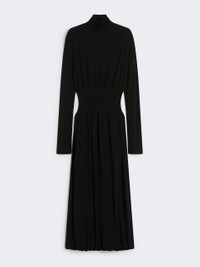 DETAILS Dress featuring an innovative soft jersey design, accented with ribbed inserts that elegantly cinch the waist. Hem with special construction that creates a twist. Stretch viscose blend crepe interlock jersey dress Unstructured fit Polo neck Ribbed viscose knit insert on collar and waist Gathering above and below the insert Hem with twist construction Fitted waist COMPOSITION AND CARE Jersey fabric 1 96% viscose, 4% elastane; jersey fabric 2 47% polyamide, 36% viscose, 14% polyester, 3% elastane; lining 100% polyamide. Hand wash cold (40°c max); do not bleach; do not tumble dry; flat drying in the shade; cool iron; professionally dry clean perchloroethylene - mild process; do not wet clean.; iron with a cloth between.; using neutral detergent.; don’t rub.; turn the articles inside out before washing.; to be ironed on reverse. Distributed by Max Mara S.r.l., registered office in Reggio Emilia (Italy), Via Giulia Maramotti 4, 42124 (IT)